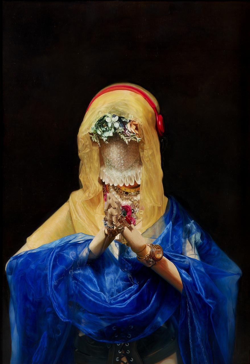 这幅画的灵感,来自17世纪画家桑索费莱托的《祈祷的圣母》。创作中,我将古典祈祷形象与耳机、气泡膜等现代消费符号拼贴结合,以廉价材料密集堆砌的手法,解构“精致生活”的虚假性,将对消费主义的批判融入古典艺术框架,让作品兼具观赏性与思想深度。