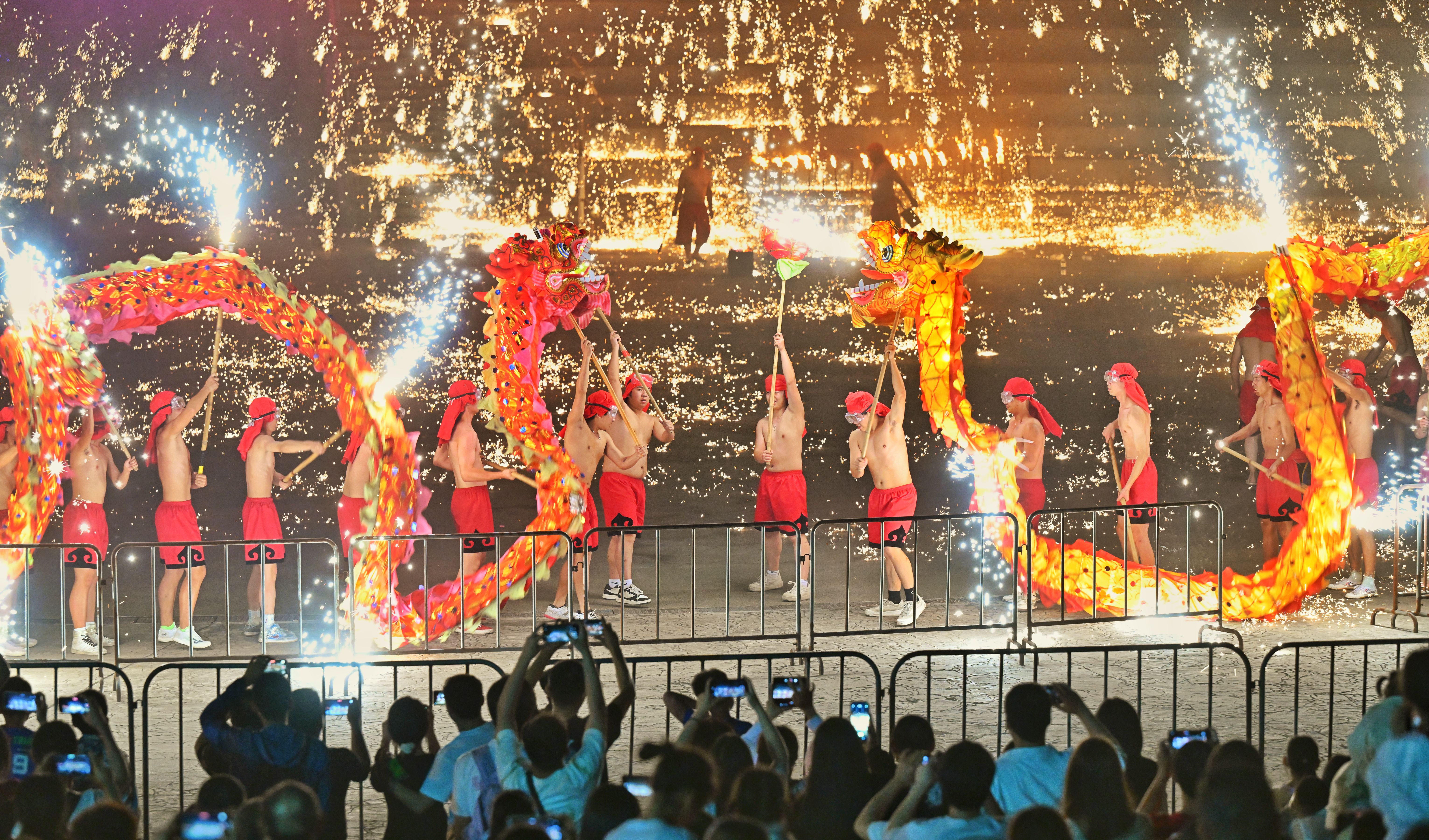 ▲游客们正在观看铜梁火龙打铁花表演。 首席记者 龙帆 摄