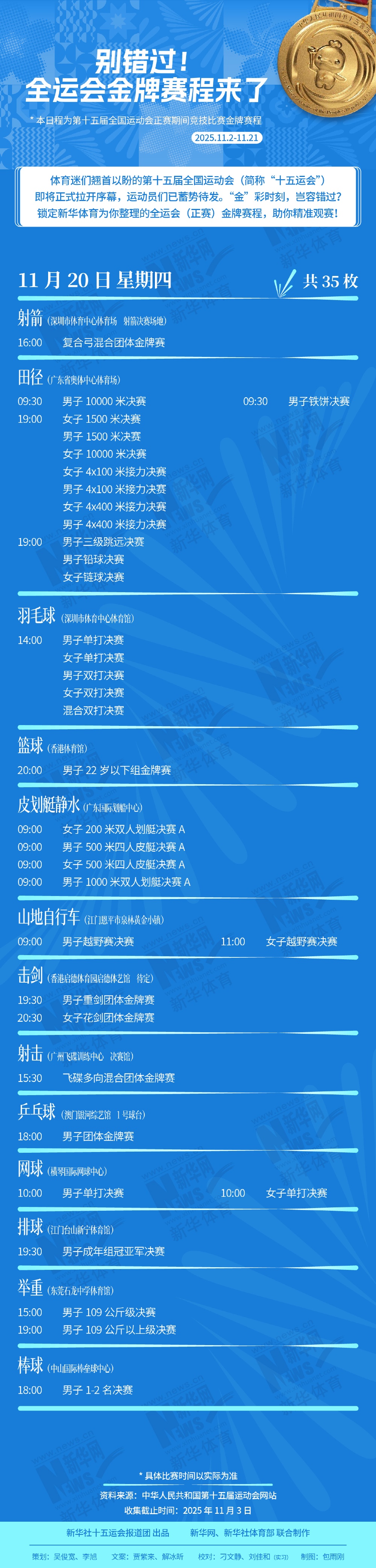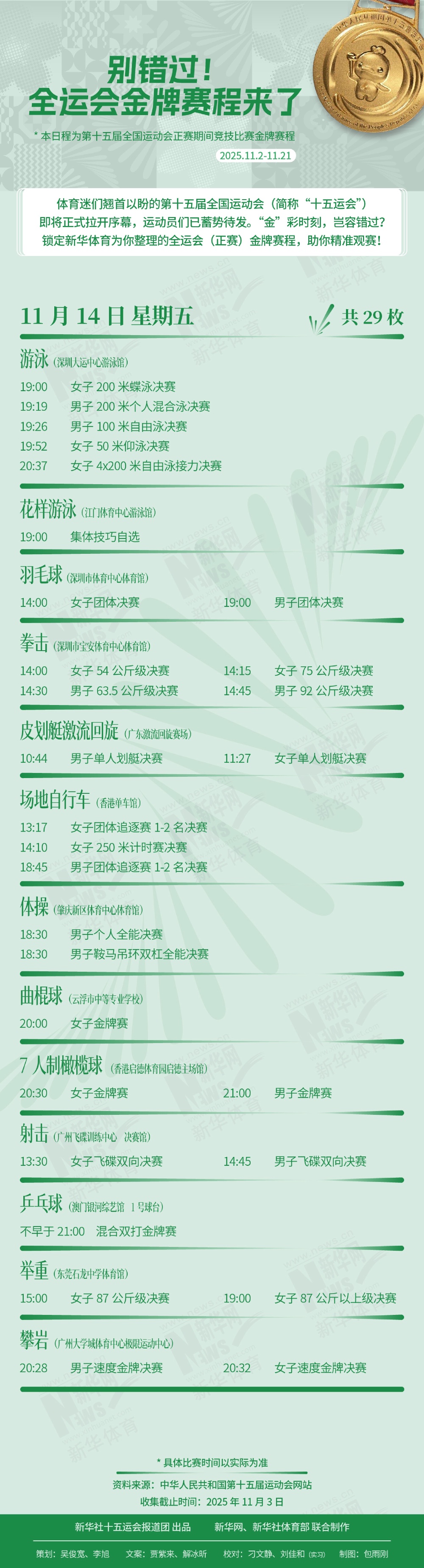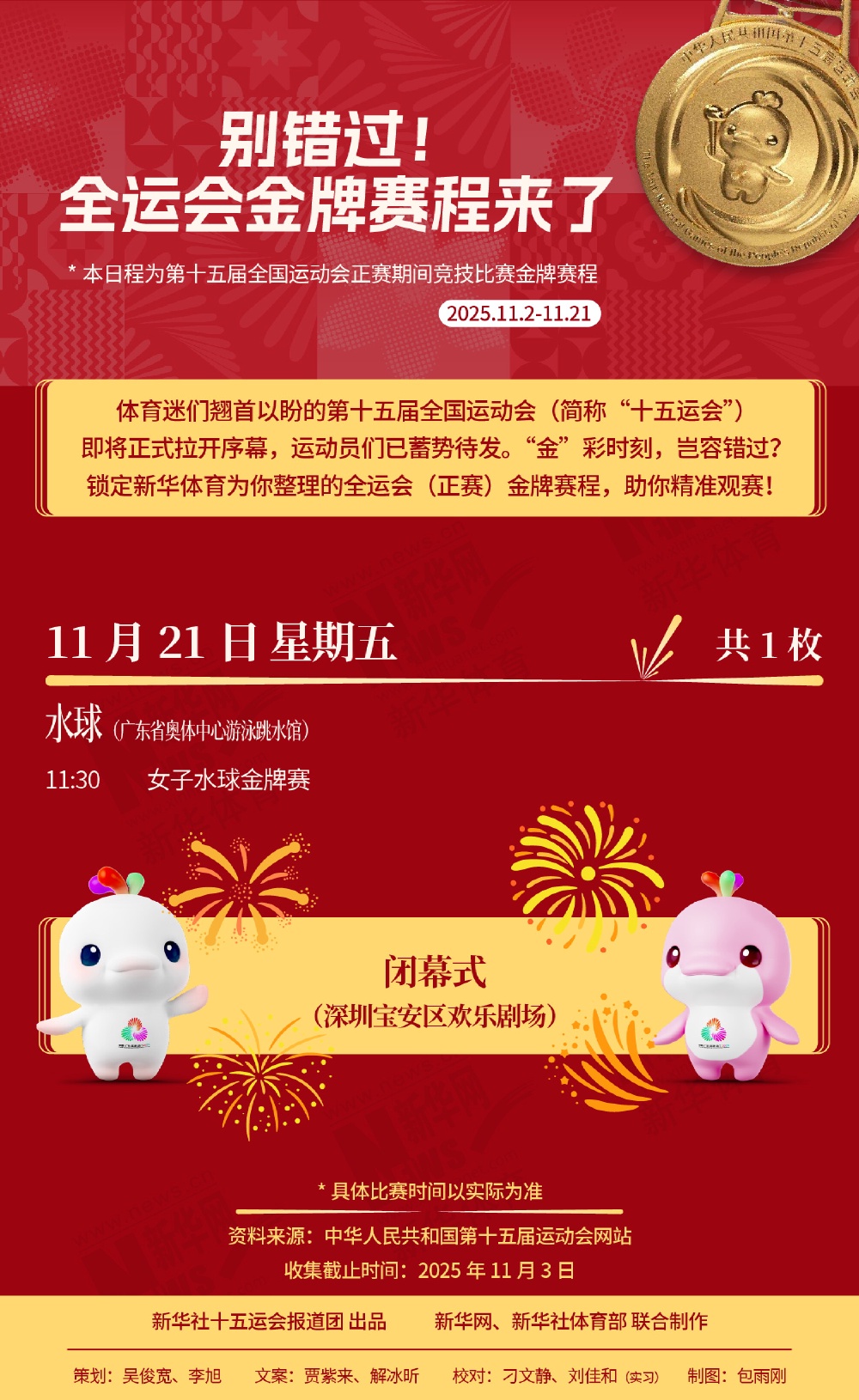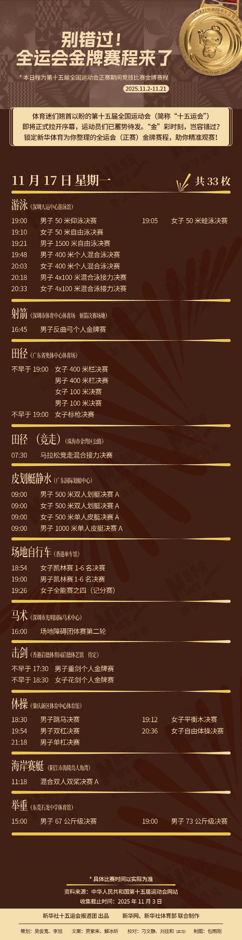体育迷们翘首以盼的第十五届全国运动会(简称“十五运会”)即将正式拉开序幕,运动员们已蓄势待发。“金”彩时刻,岂容错过?锁定新华体育为你整理的全运会(正赛)金牌赛程,助你精准观赛!