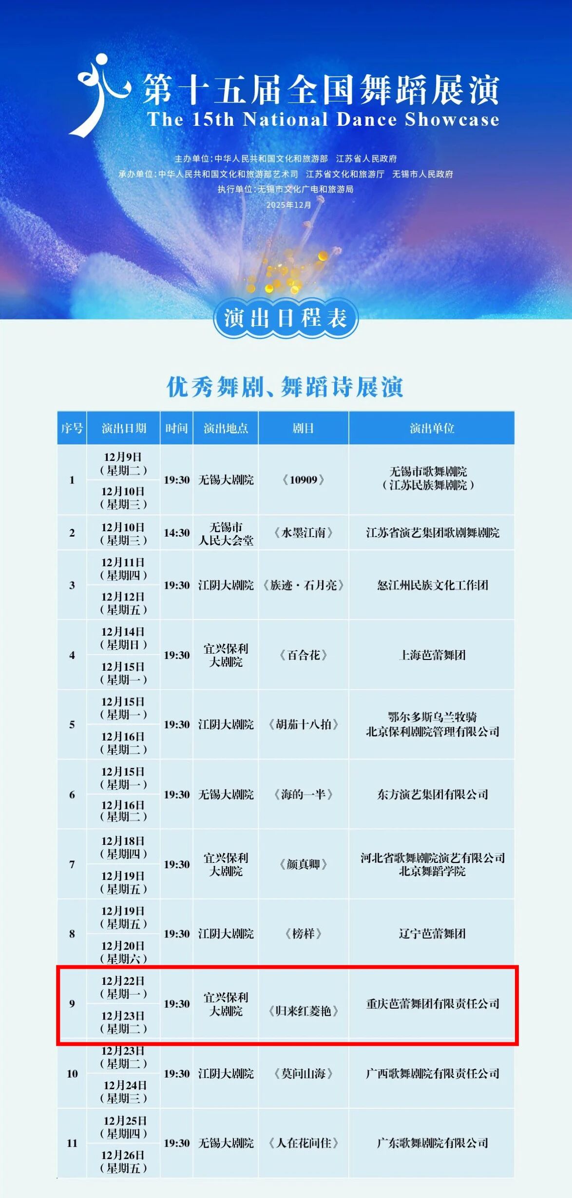 第十五届全国舞蹈展演由文化和旅游部、江苏省人民政府主办,将于12月10日在无锡启幕并持续至26日。本次展演汇聚了全国31个省(区、市)及新疆生产建设兵团的顶尖舞蹈作品,涵盖10部舞剧、舞蹈诗剧与51个舞蹈节目。参演剧(节)目编导以中青年为中坚力量,尽显中国舞蹈事业的蓬勃生机。