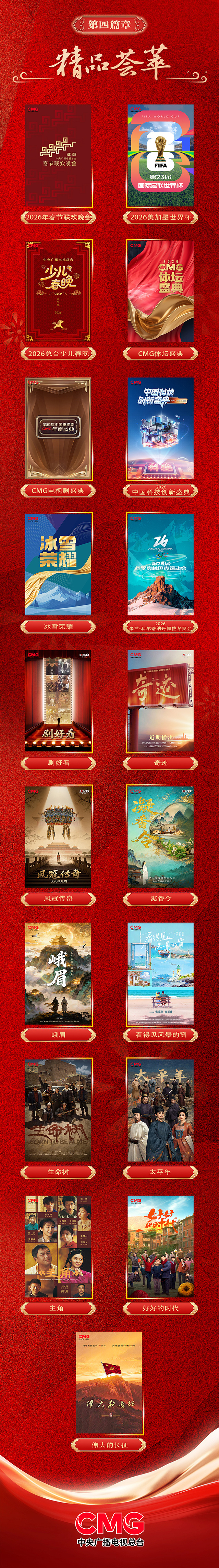其中,“万千气象”篇章聚焦高质量发展、科技自立自强、建设现代化产业体系等重大主题,彰显新时代伟大变革与辉煌成就。大型工业文化节目《中华考工记(第二季)》从中国现存最早的手工业技术专著《考工记》切入,以史溯源,揭示世界上最完整工业体系背后的力量之源与文化之基;系列节目《深海装备》《航天智造》《能源动脉》《中国新基建》等全景展现国资央企在关系国民经济命脉的重要行业和关键领域发挥的重要作用;春节特别节目《马到成功·中国年》走进被誉为“活态年俗博物馆”的甘肃陇南,带领观众体验各地新春民俗,送上饱含文化底蕴的新年祝福;《2026城市风华录》《三餐四季(第四季)》《夜未央》《寻味山海(第二季)》等品牌节目持续上新,探索城市治理智慧,展现人间烟火与美好生活,探寻食物背后的自然基因与人文故事。