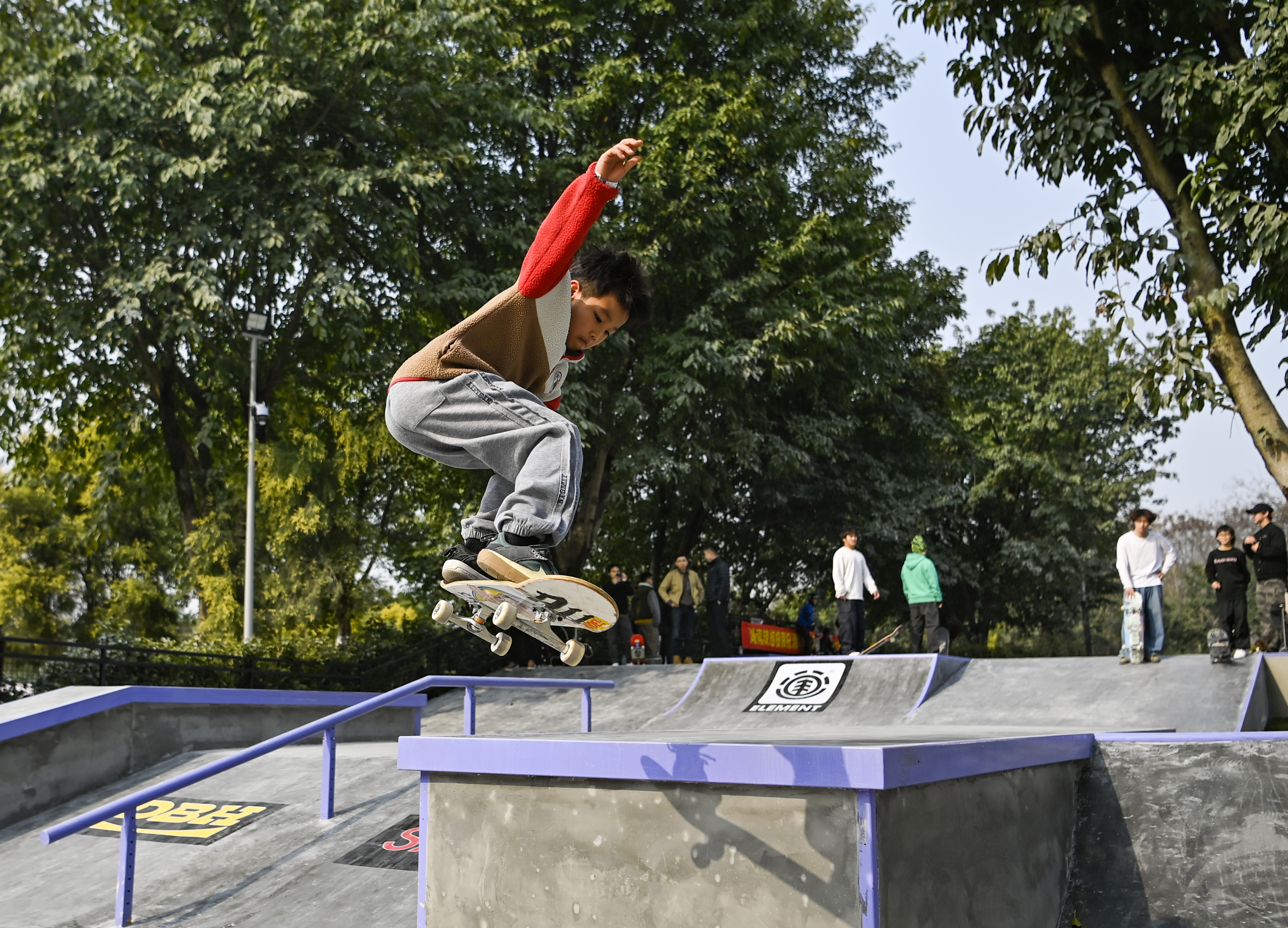 滑板运动在竞技体育中也有了一席之地——自滑板运动2020年正式进入奥运会以来,我国滑板选手屡创佳绩。东京奥运会,年仅16岁的中国选手曾文蕙拿到第6名,创造了中国滑板奥运会最佳成绩;2023年杭州亚运会,13岁的崔宸曦成为中国最年轻的亚运会冠军。如今,两江新区滑板运动发展迅速,在2024年重庆市第七届运动会上狂揽5金4银3铜,已成为重庆滑板运动的发展高地。