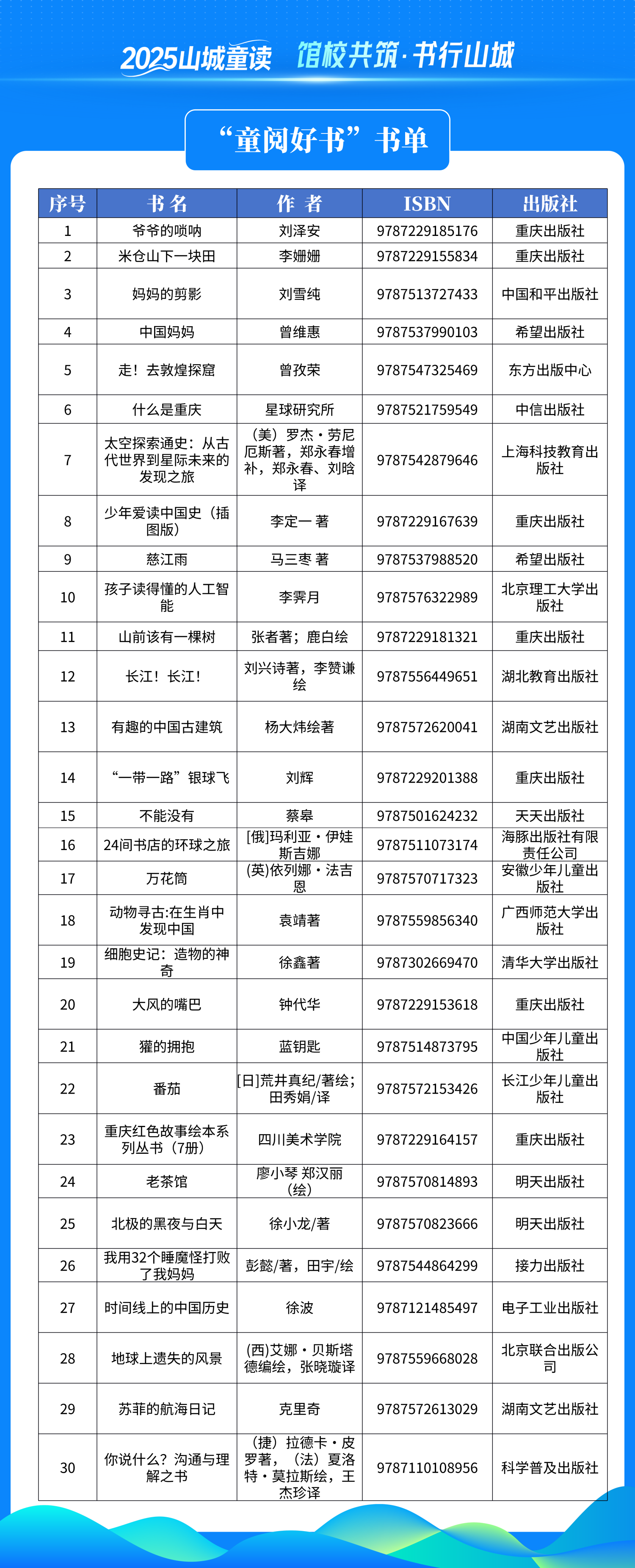 《什么是重庆》以“山、水、人、城”为脉络,用一本书展现新韵重庆之美;《爷爷的唢呐》以少年儿童视角聚焦非遗,吹响了中华优秀传统文化传承的嘹亮之歌;《中国妈妈》以两代中国妈妈的大爱故事,讲述了中非共建“一带一路”的丰硕成果……11月26日,记者从重庆市少年儿童图书馆获悉,由全市39家公共图书馆联合教育部门、出版单位及专家学者共同评选的2025年度“童阅好书”书单发布,入选的30种图书将面向全市少年儿童和亲子家庭推荐。