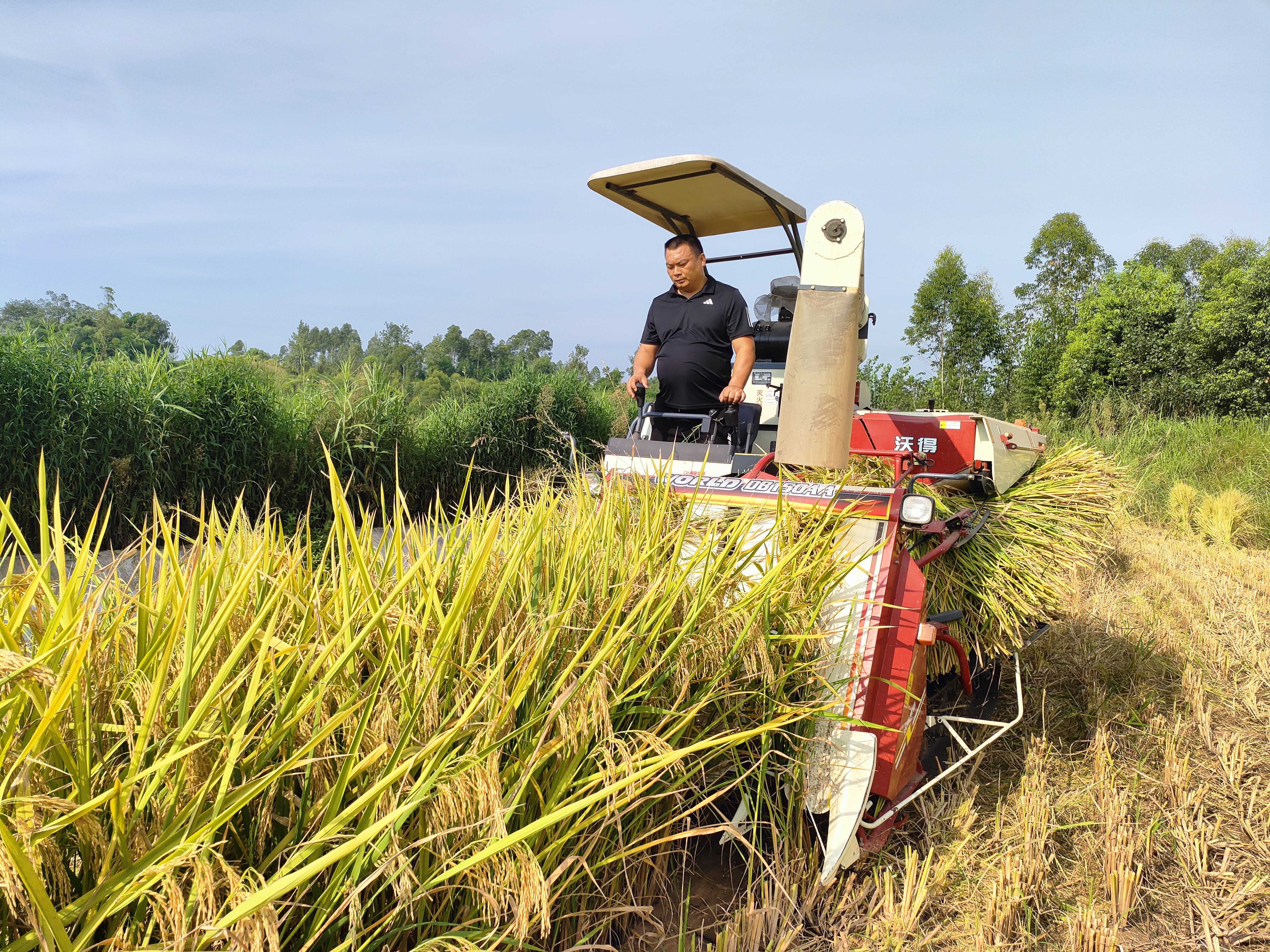 ▲李刚驾驶联合收获机正在抢收水稻。受访者供图