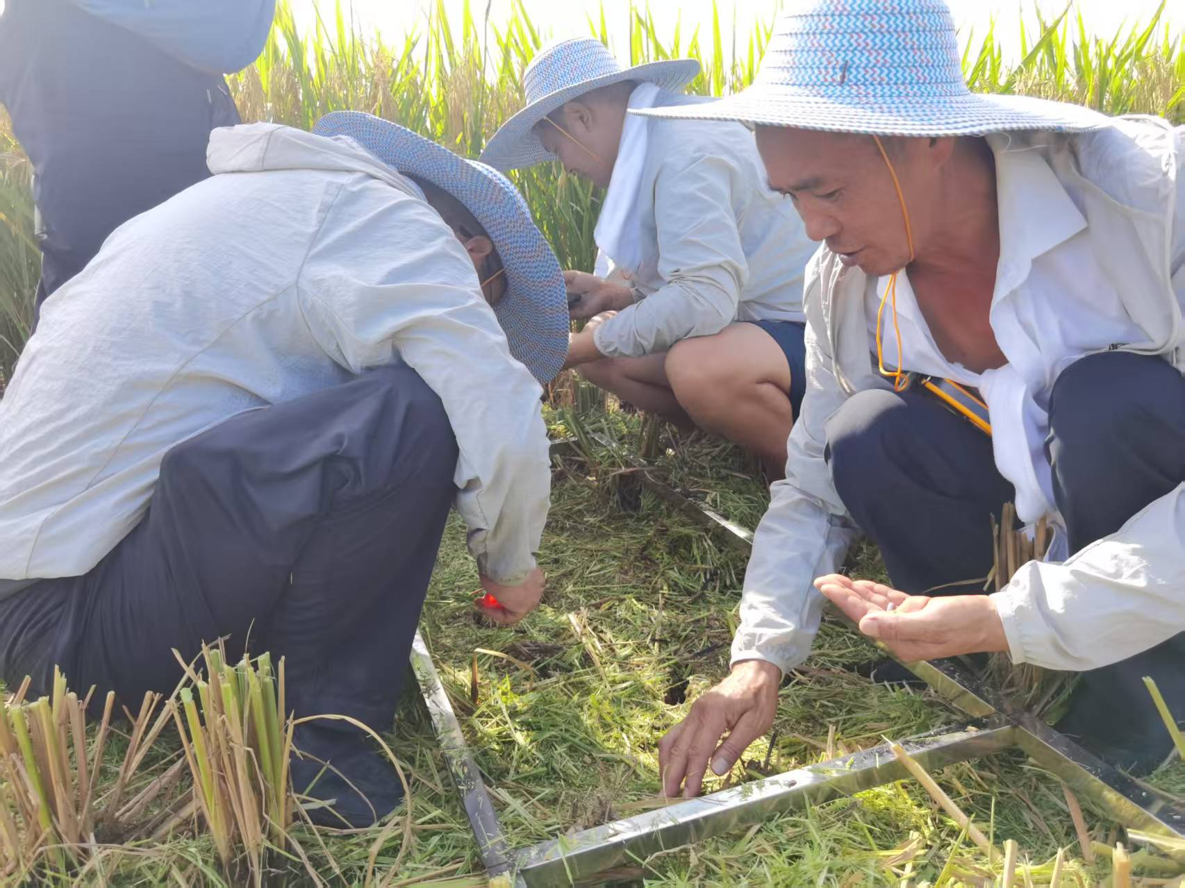 ▲农机手们在数机收漏掉的稻谷粒。受访者供图