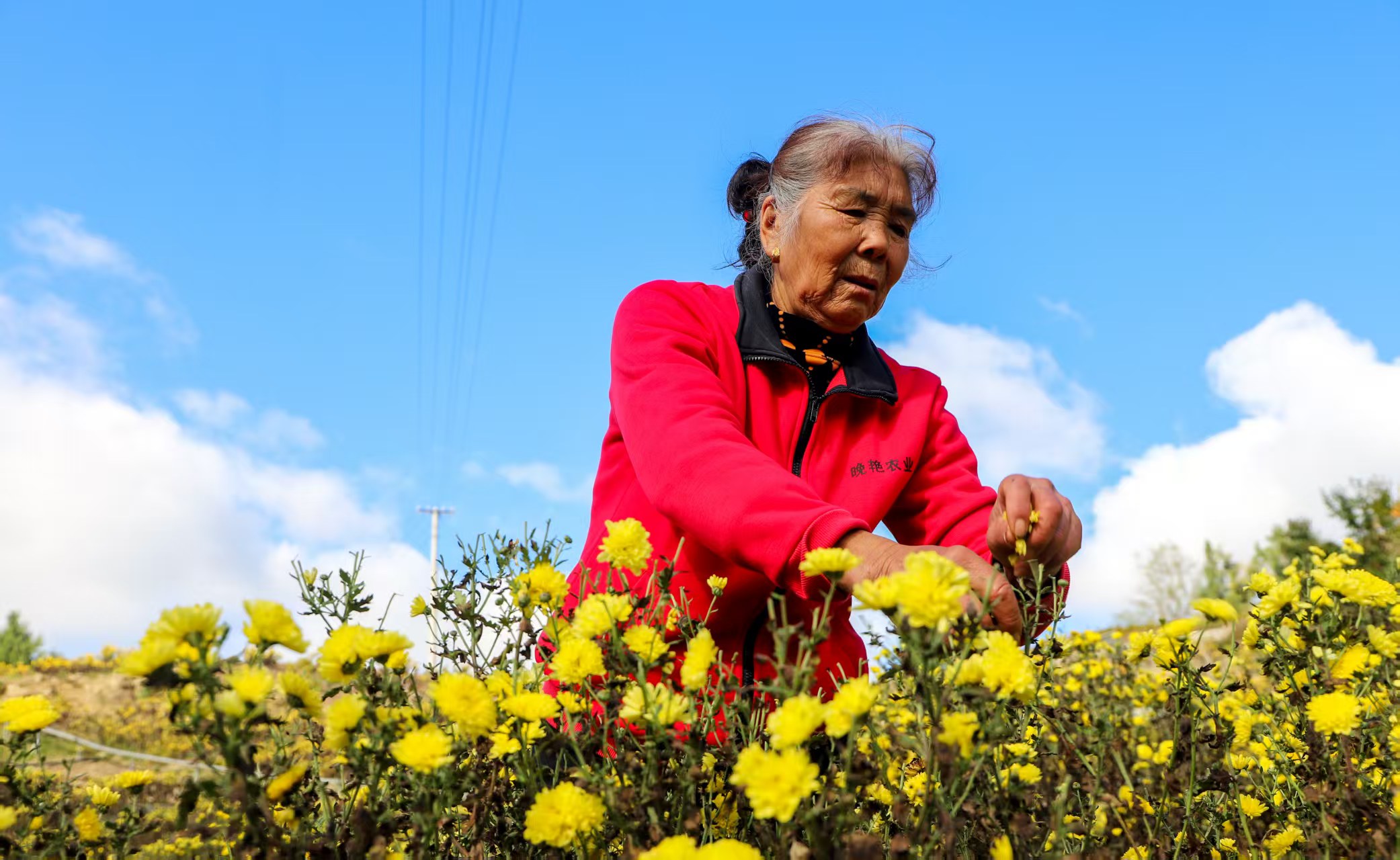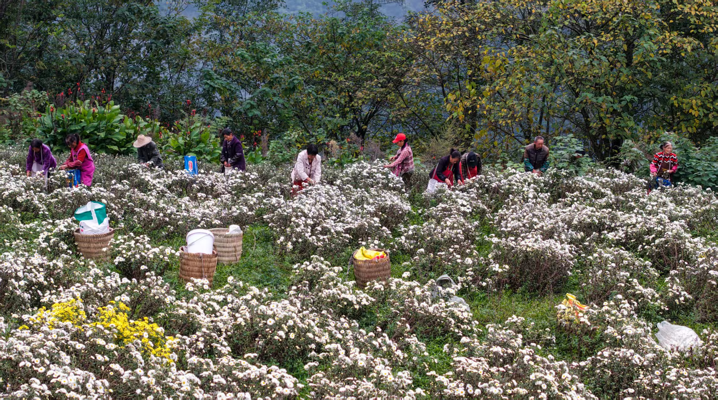 在盘龙街道革新村的三峡阳菊种植基地,连片菊花在山坡上竞相绽放。花农们穿梭于花田,手指轻巧地将菊花采下放入背篓。“我们按采收量计酬,一天能挣一百多块钱。”村民杨五发说。
