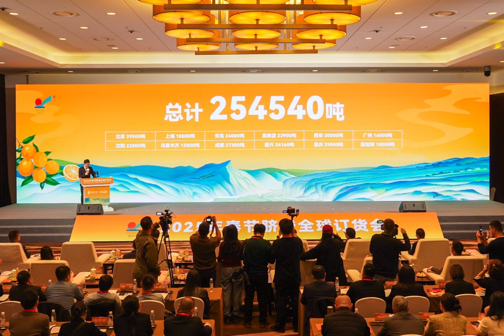 ▲11月11日,2025年奉节脐橙全球订货会上公布签约数量。记者 李雨恒 摄