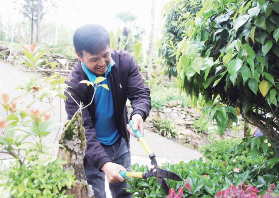 ▲彭水县龙塘乡石院村,村民卢国军正在修剪自己栽种的绿植。受访者供图