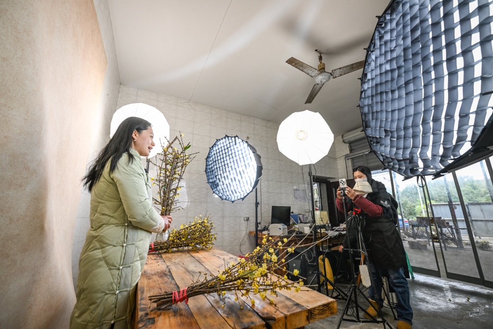 ▲北碚区静观镇素心村,村民正在直播间介绍蜡梅花。首席记者 龙帆 摄/视觉重庆