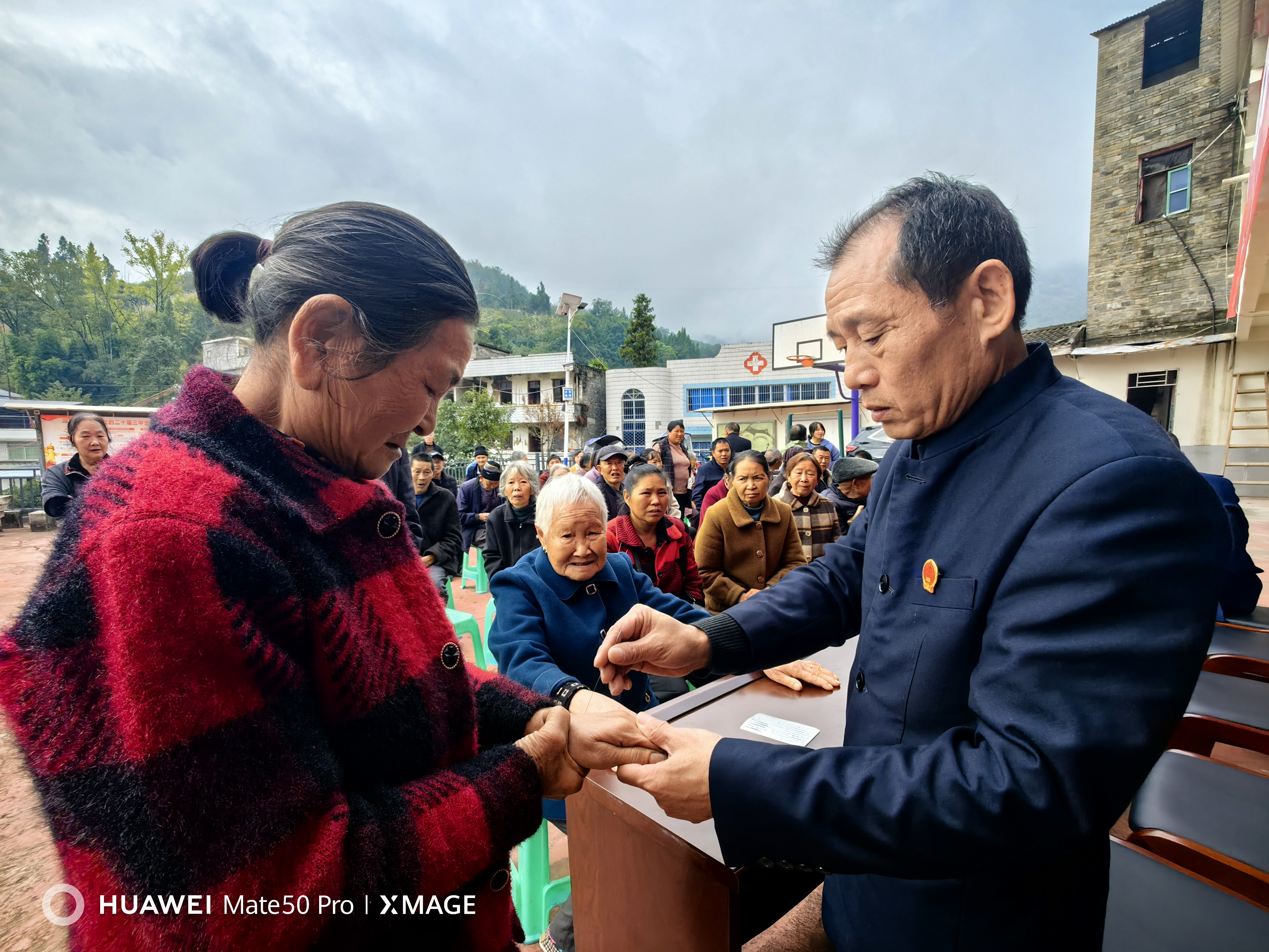 集中讲解结束后,夏川和李正坤分别“摆摊”,为老人们一对一诊疗。夏川专注颈椎和腰椎问题,现场针灸推拿,手法精准;李正坤则以民族技法调理风湿疼痛,耐心细致。老人们分成两列,依次候诊,院坝里暖意融融。
