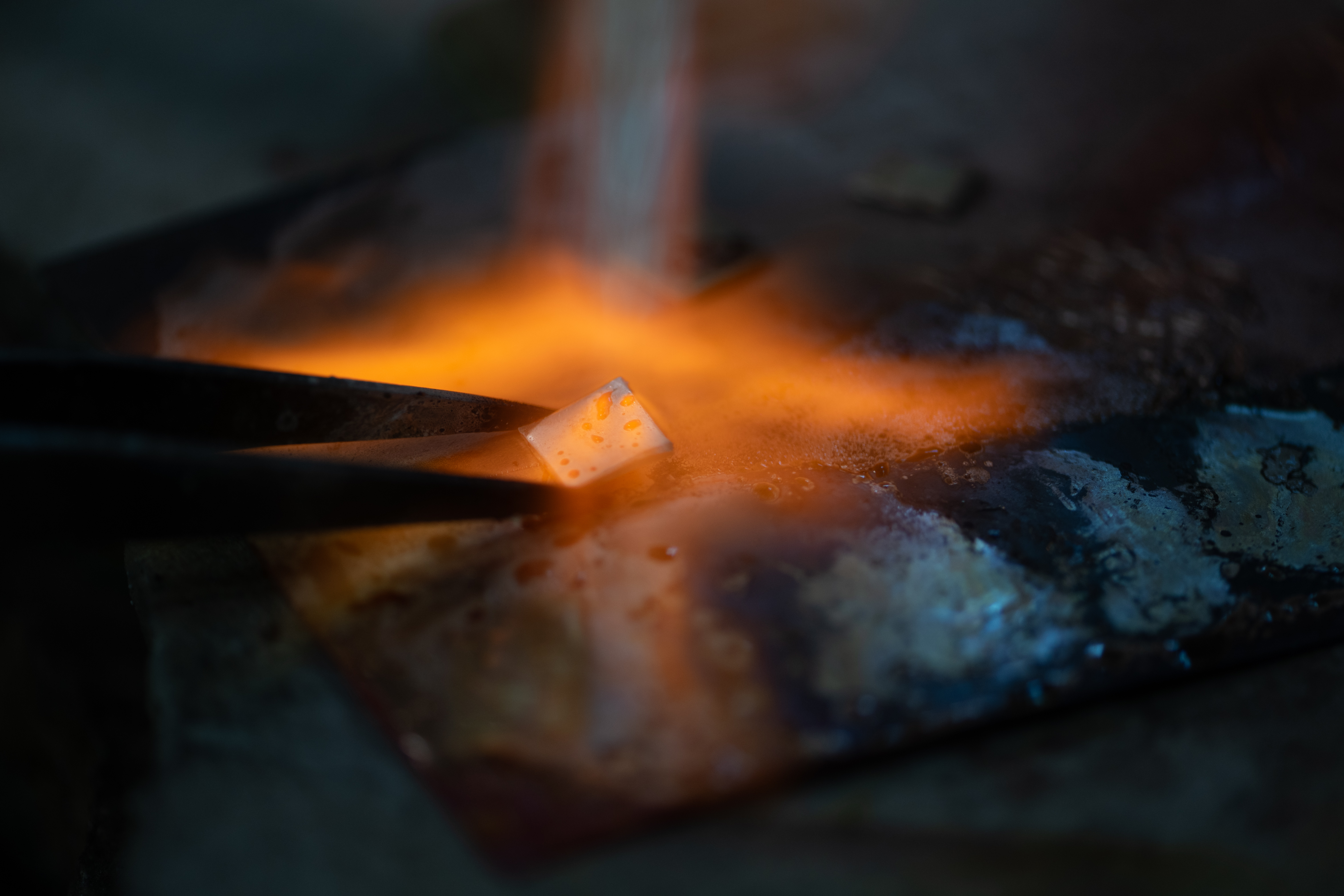 ▲10月25日,在昆明乌铜走银传习馆,匠人将放置在乌铜片表面的银片融化,进行“走银”。新华社记者 江文耀 摄