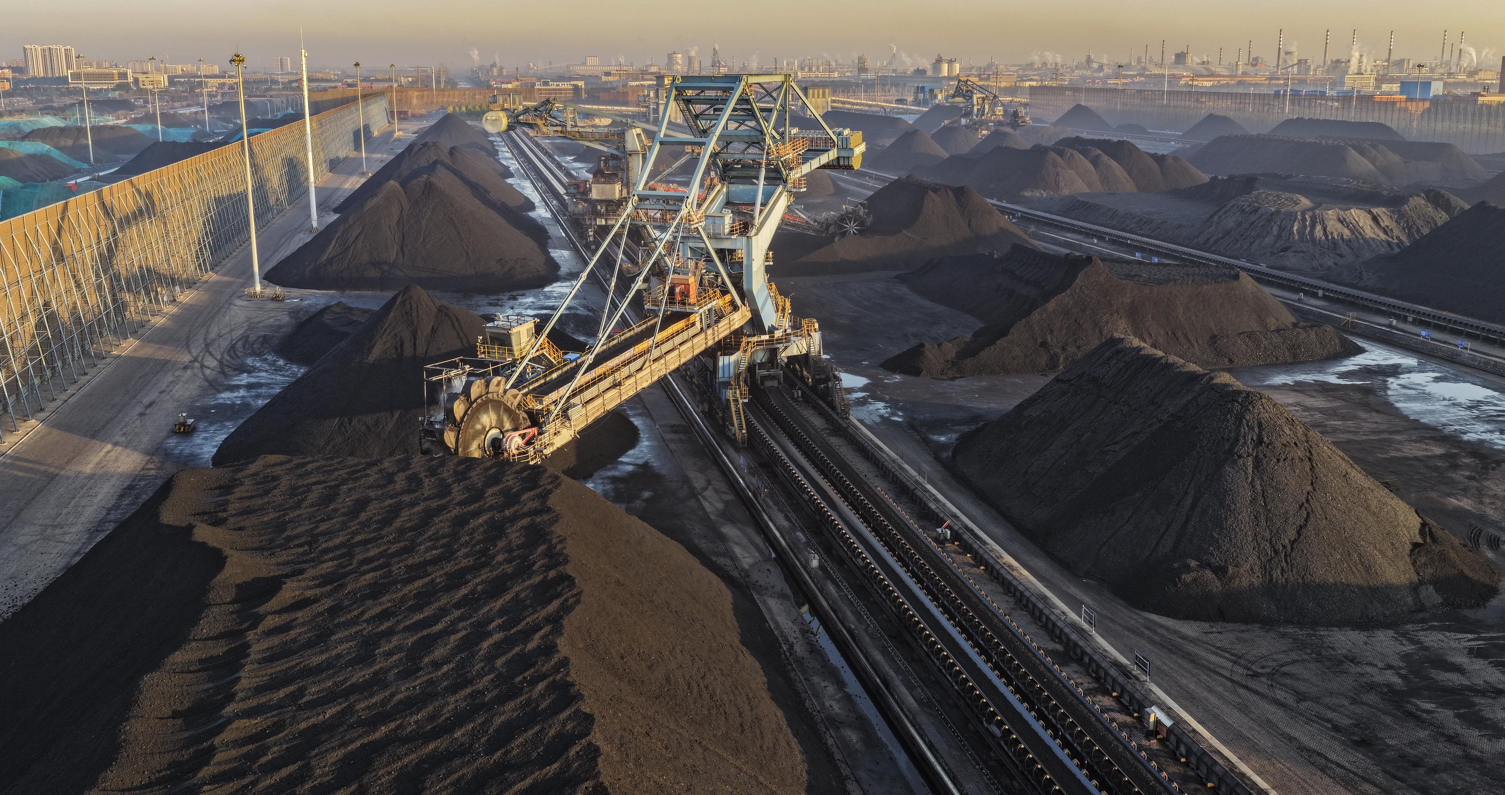 ▲10月27日,河北省唐山港京唐港区煤炭堆场,工人操作转运设备向码头转运电煤(无人机照片)。新华社发(刘满仓 摄)