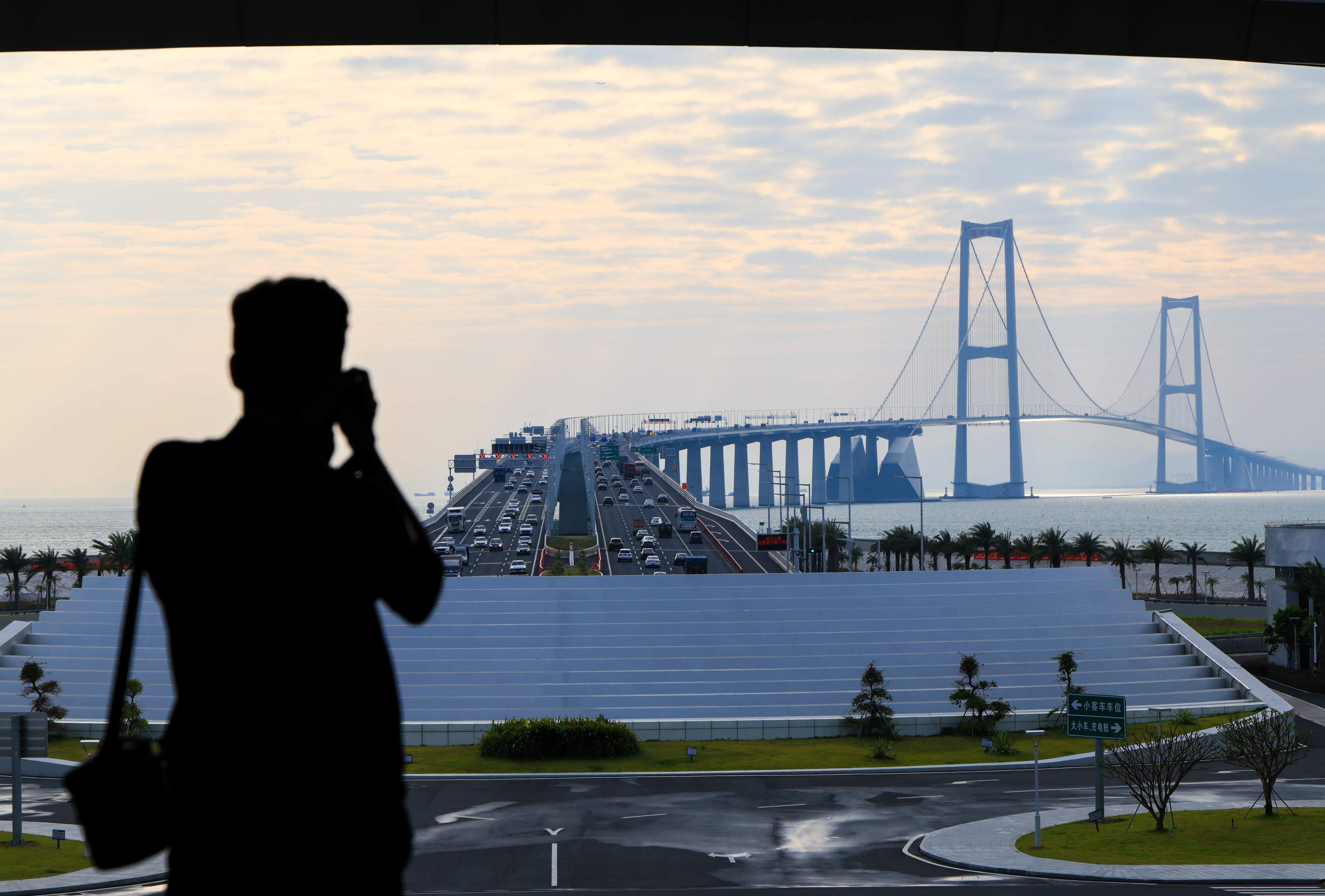 ▲10月25日,游客在深中通道西人工岛中庭的观景平台拍摄深中大桥。新华社记者 毛思倩 摄