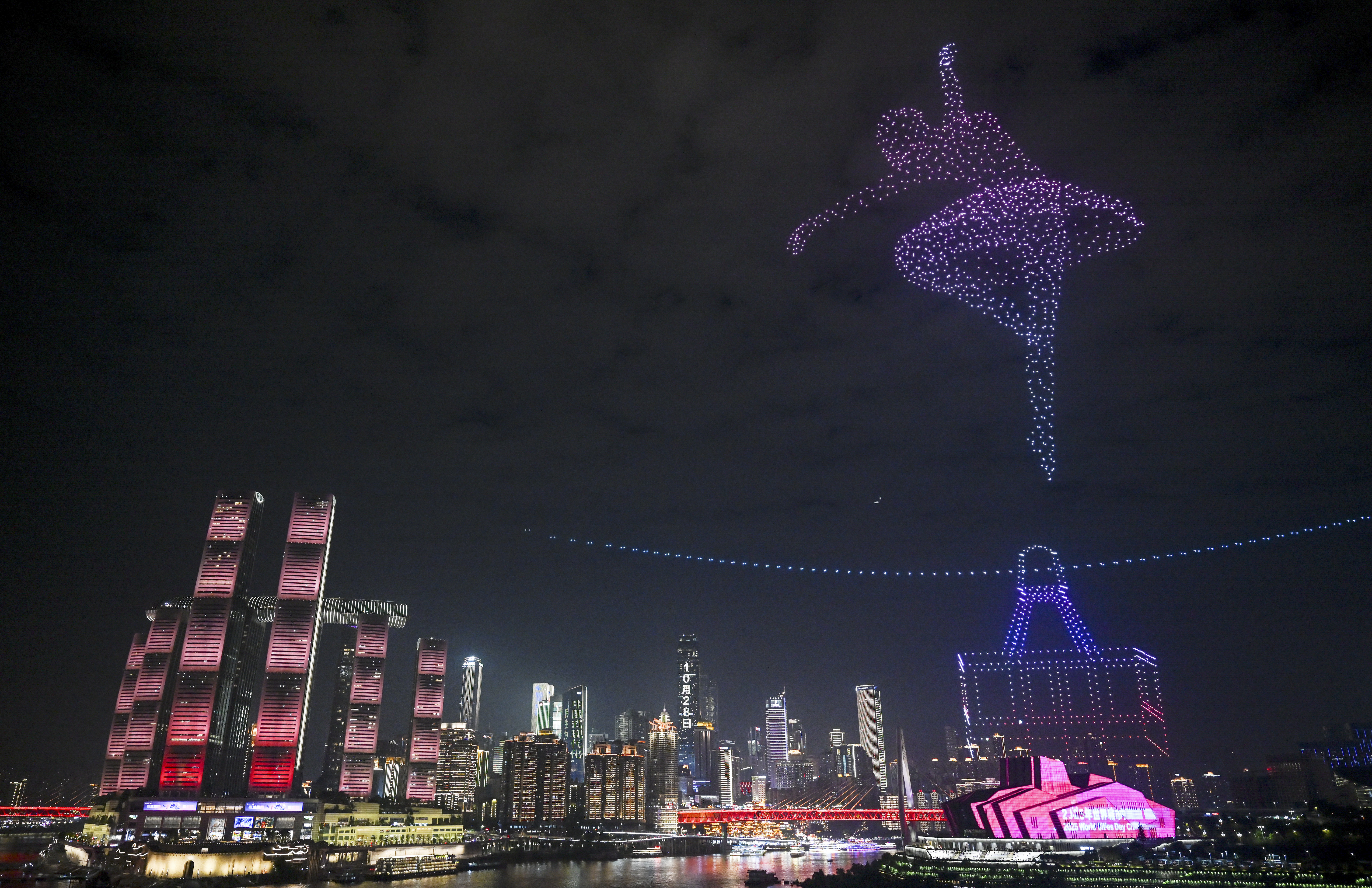 ▲这是10月27日晚在重庆市南岸区南滨路拍摄的世界城市日专场无人机灯光秀表演活动。新华社记者 陈诚 摄