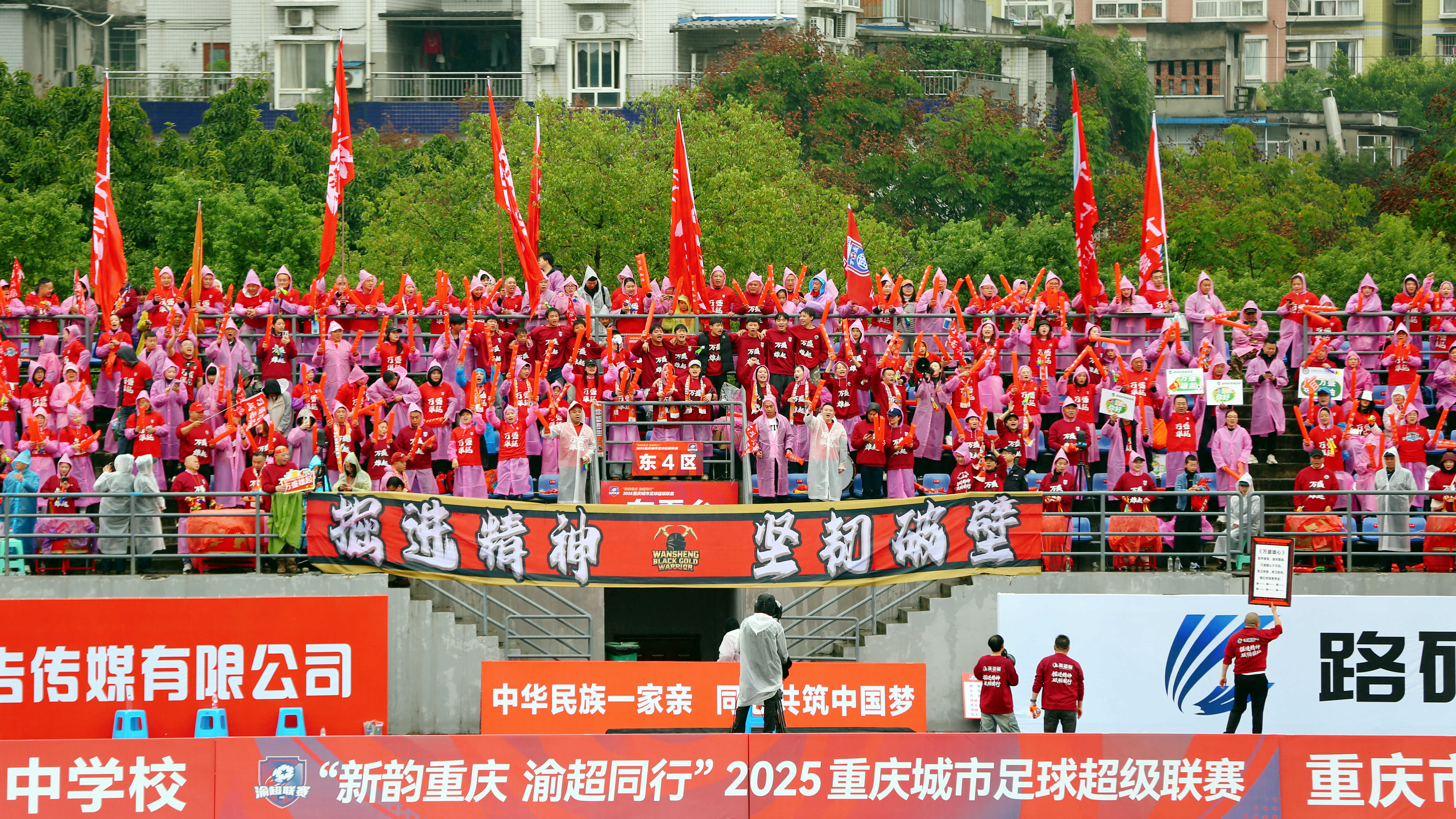 ▲11月1日,万盛文体中心体育场,万盛黑山谷队球迷为球员摇旗呐喊。通讯员 王泸州 摄