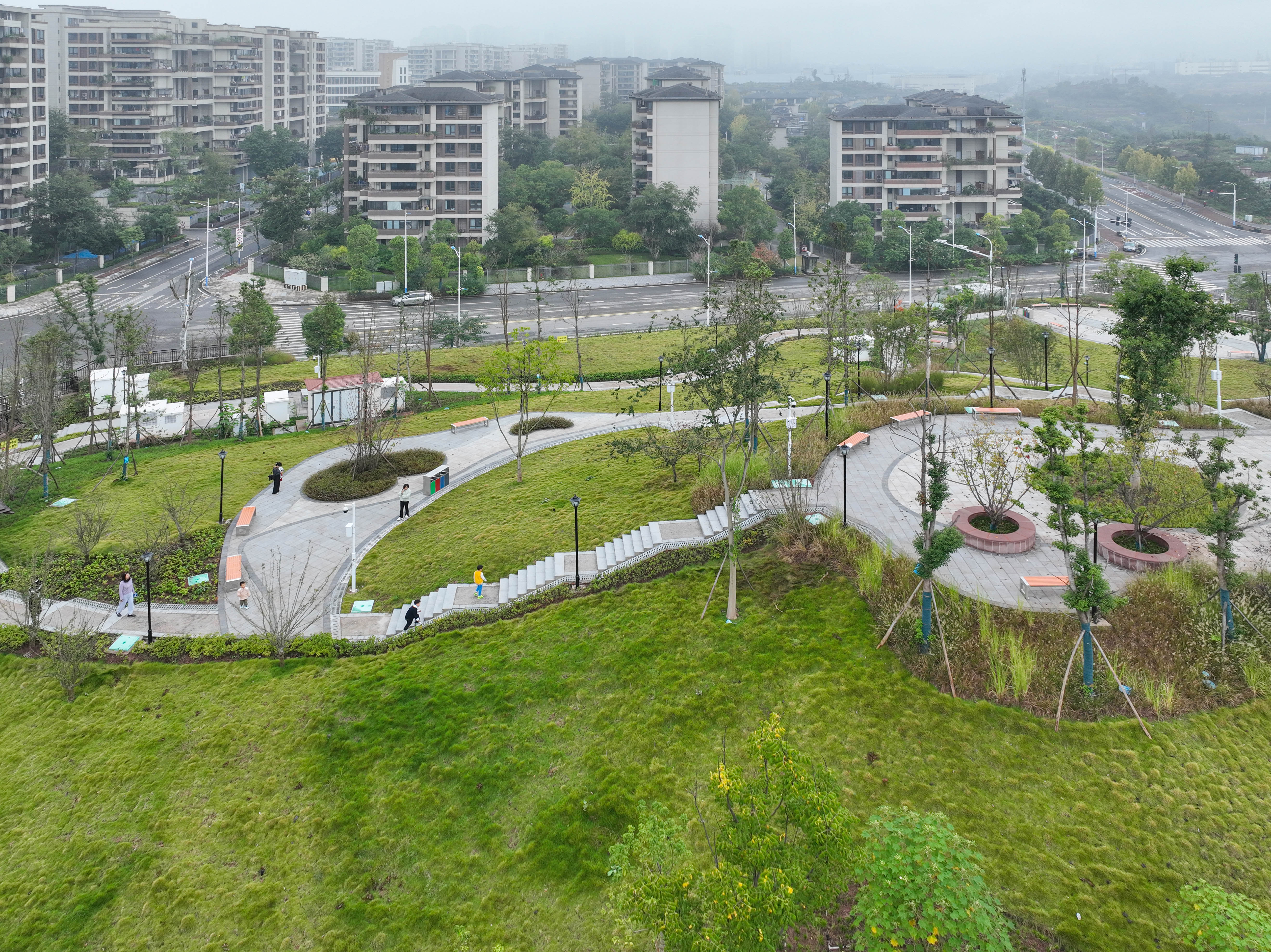 ▲2025年11月2日,两江新区水土新城复兴轨道站附近,呈不规则梯形的小山坡已变身为绿意盎然的口袋公园。该项目景观面积约9320㎡。记者 张锦辉 摄