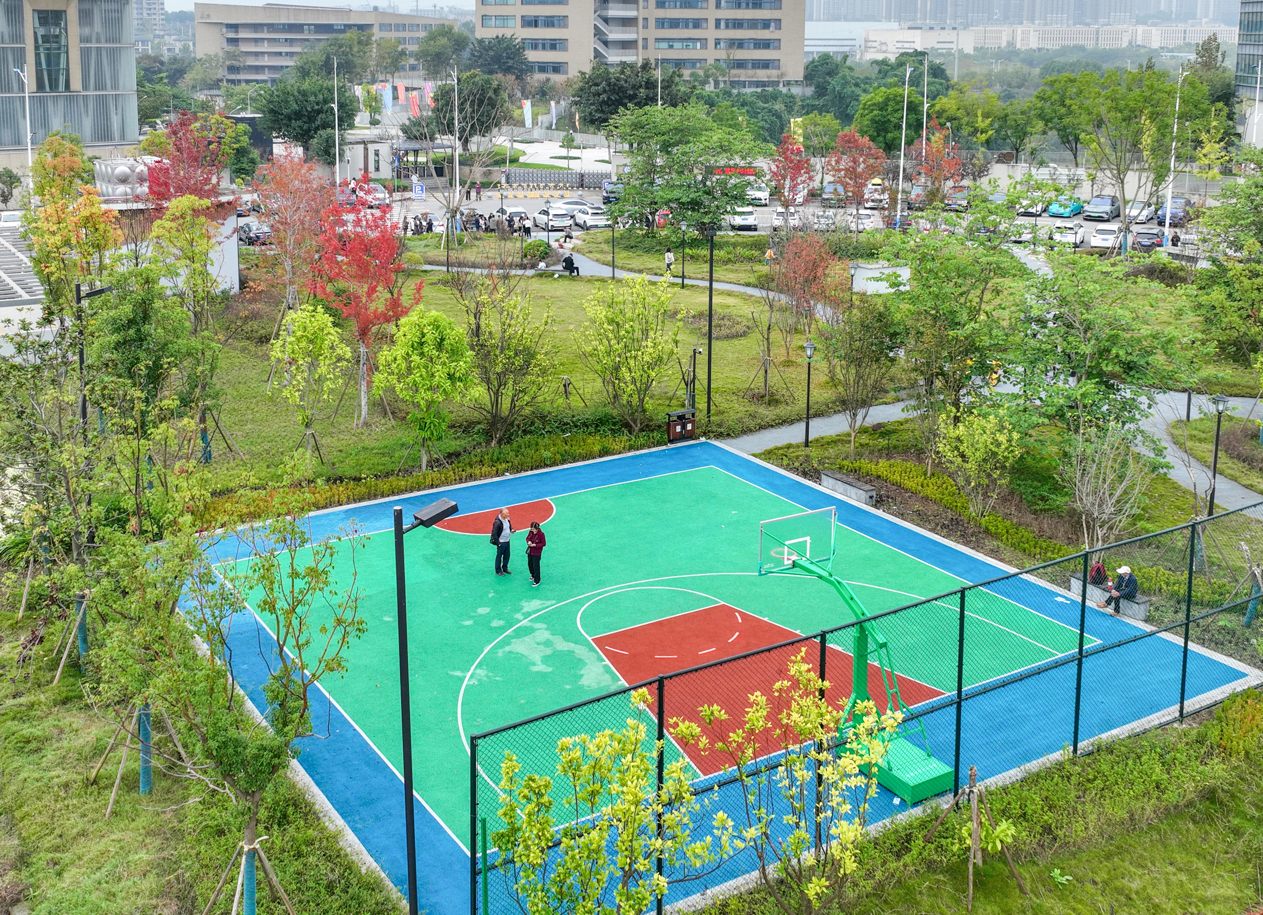 ▲11月2日,两江新区水土新城西大附中水土校区2号门旁,全新的篮球场铺展在口袋公园的绿地上。该项目景观面积约4738㎡,配备了一个半场篮球场及地下停车场。记者 张锦辉 摄