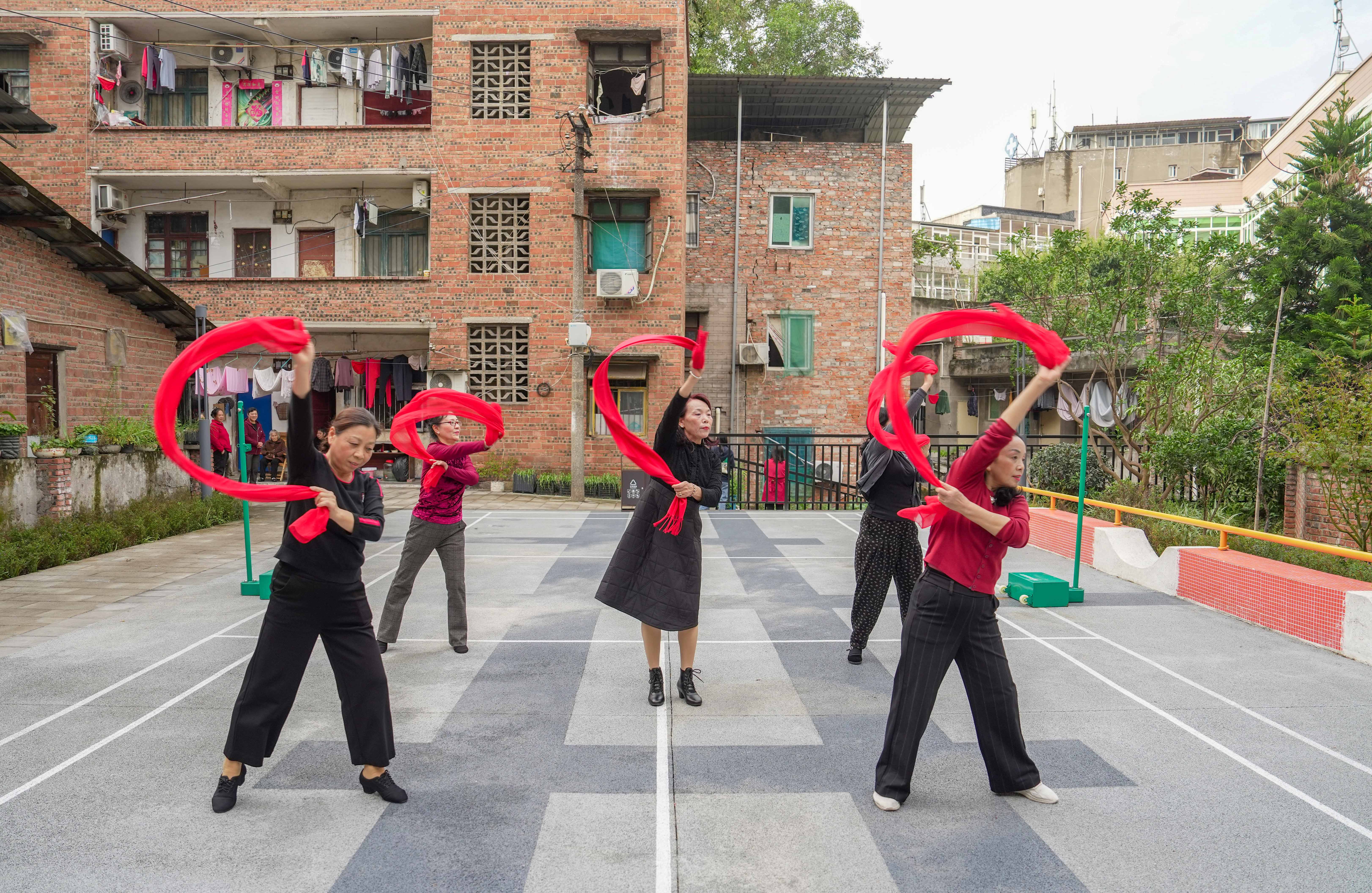 ▲10月27日,重庆高新区白市驿镇驿路口袋公园,居民在崭新的羽毛球场排练舞蹈。该项目近日通过验收。记者 张锦辉 摄