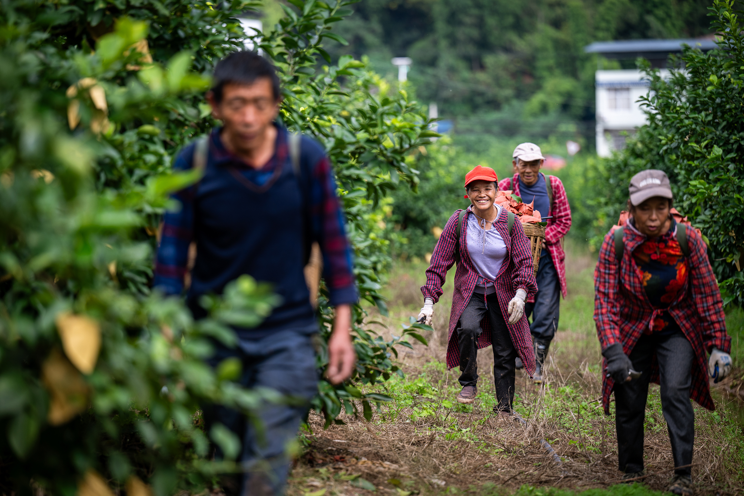 ▲2025年11月4日,潼南区柏梓镇羊堡村,农民们将采收的柠檬背出果园,脸上充满笑容。记者 张春晓 摄