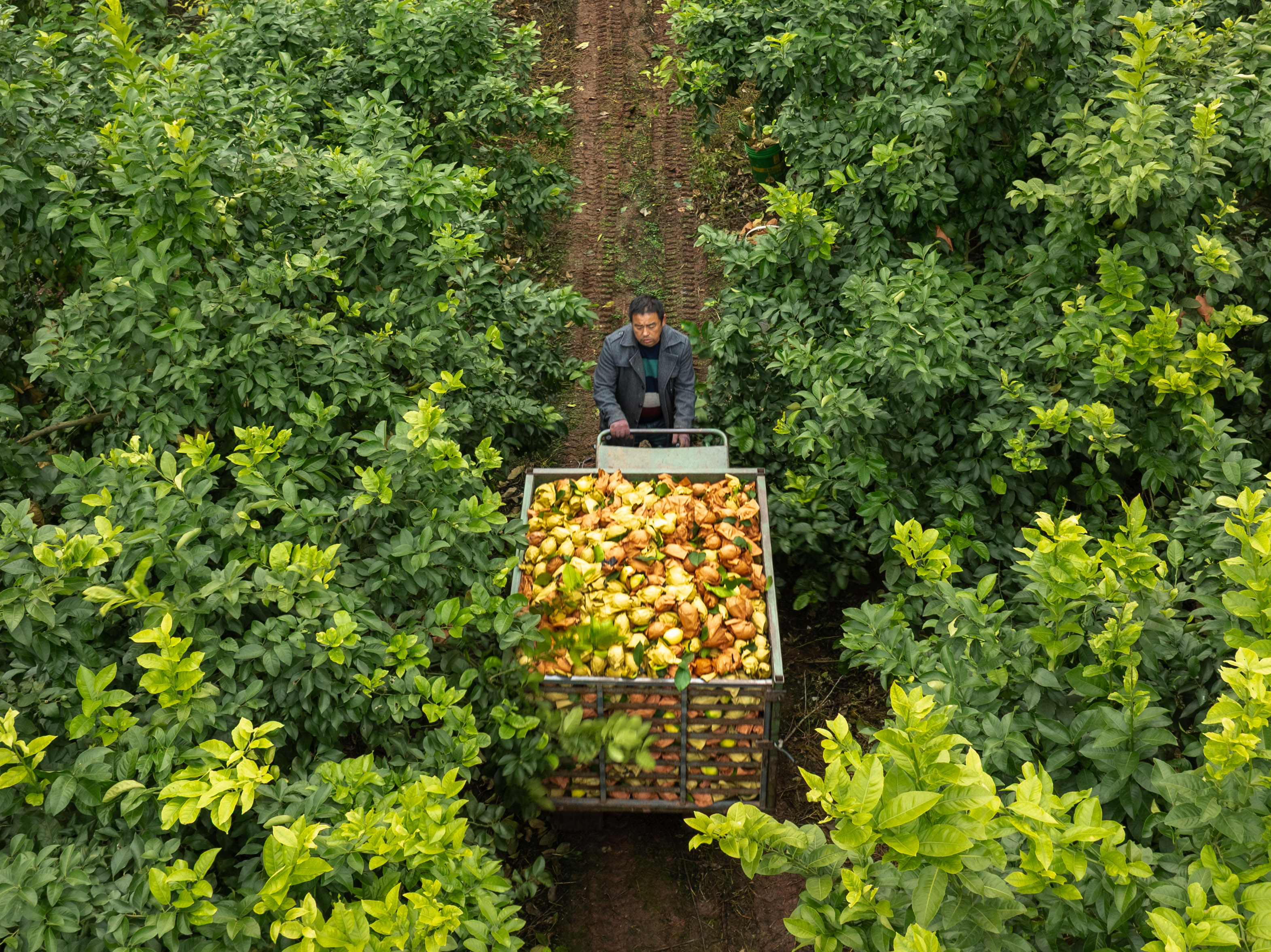 ▲11月18日,潼南区柏梓镇哑河村,果农在采收柠檬(无人机照片)。记者 李雨恒 摄