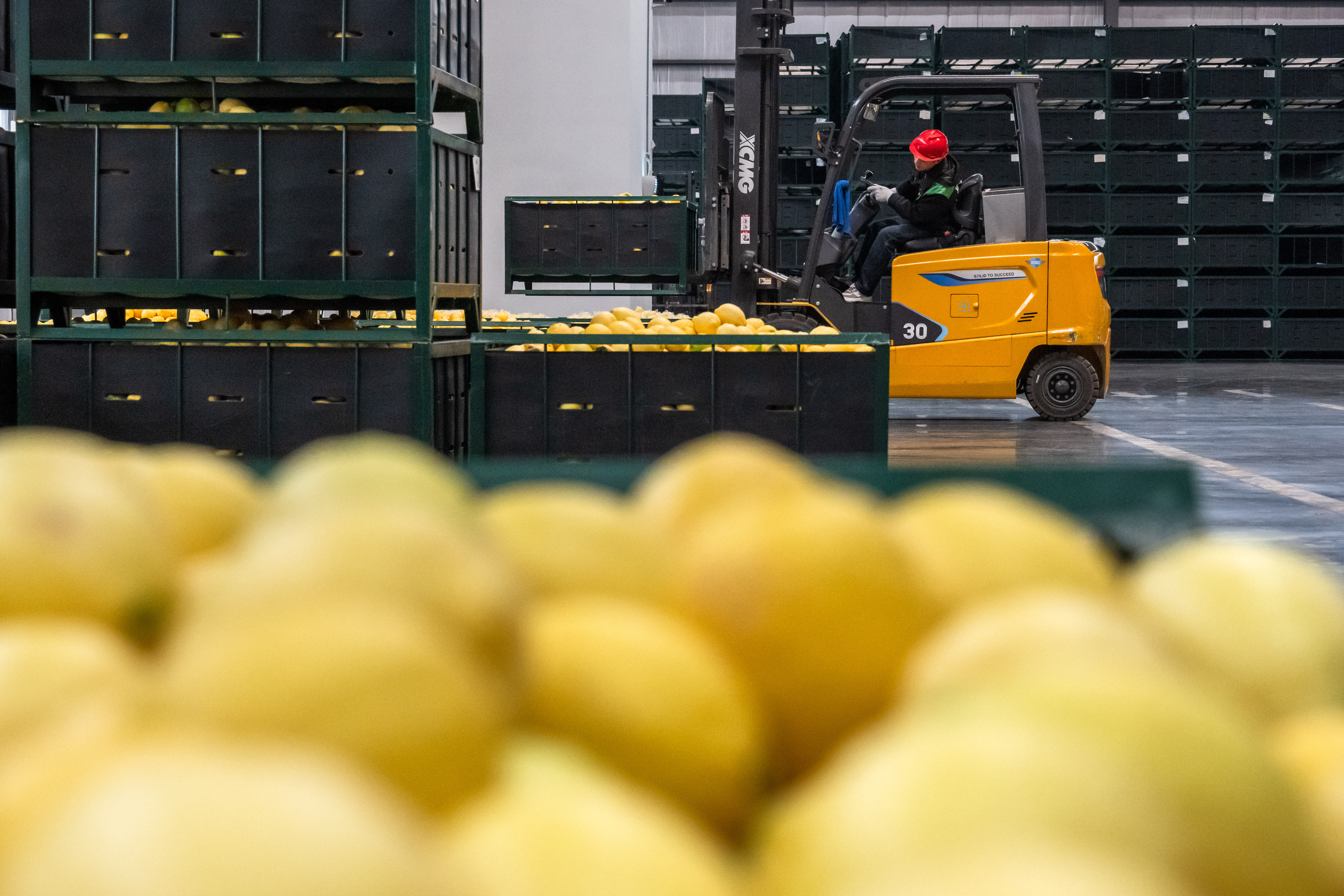 ▲11月18日,潼南区雪王农业加工中心,工人驾驶叉车搬运柠檬。记者 李雨恒 摄