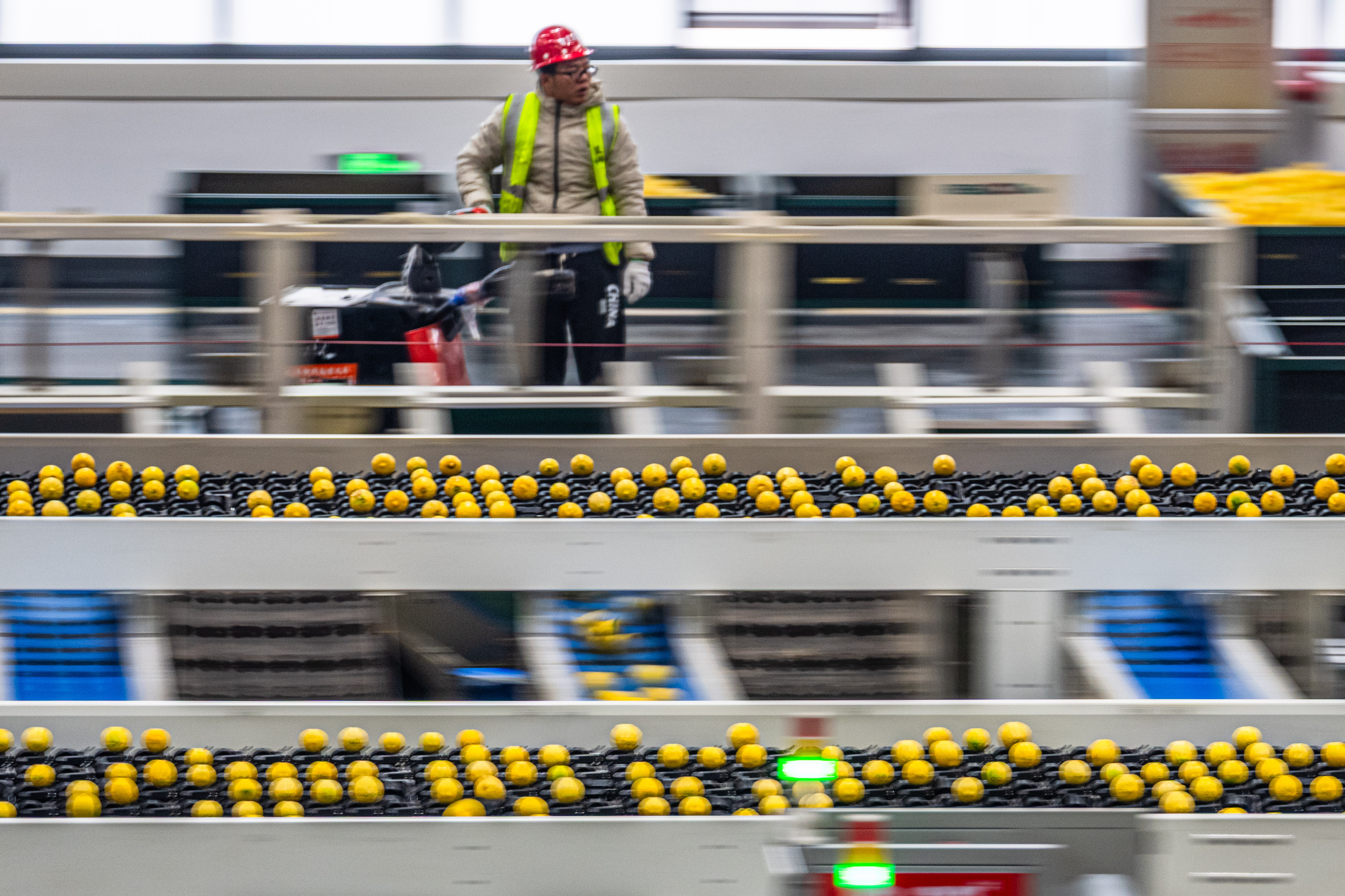 ▲11月18日,潼南区雪王农业加工中心,机械臂在进行柠檬自动化分拣、装箱作业。记者 李雨恒 摄