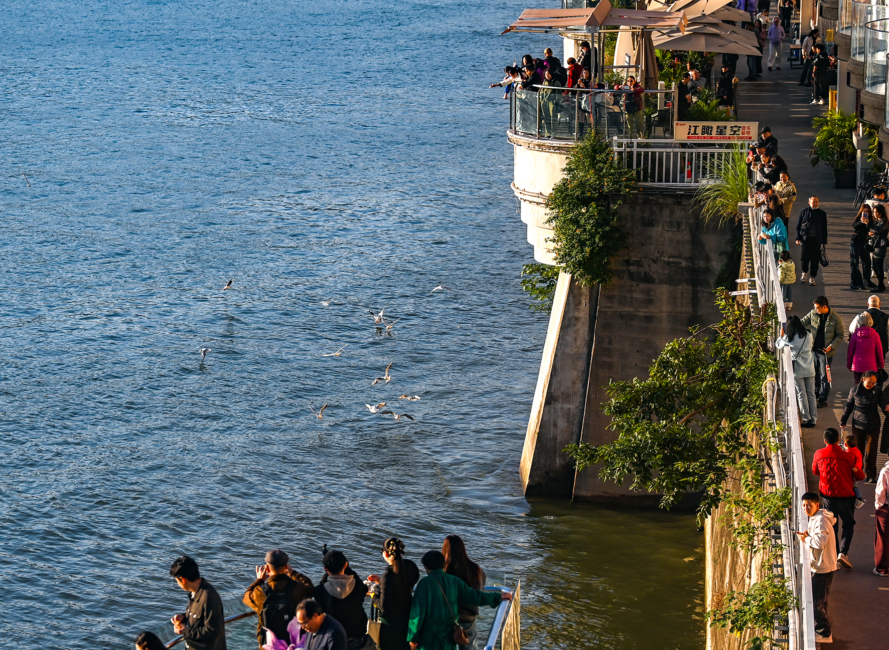 ▲2025年11月19日,南岸区南滨路两江交汇水域,大批西伯利亚红嘴鸥在水中嬉戏,吸引众多市民驻足观赏。记者 郑宇 摄