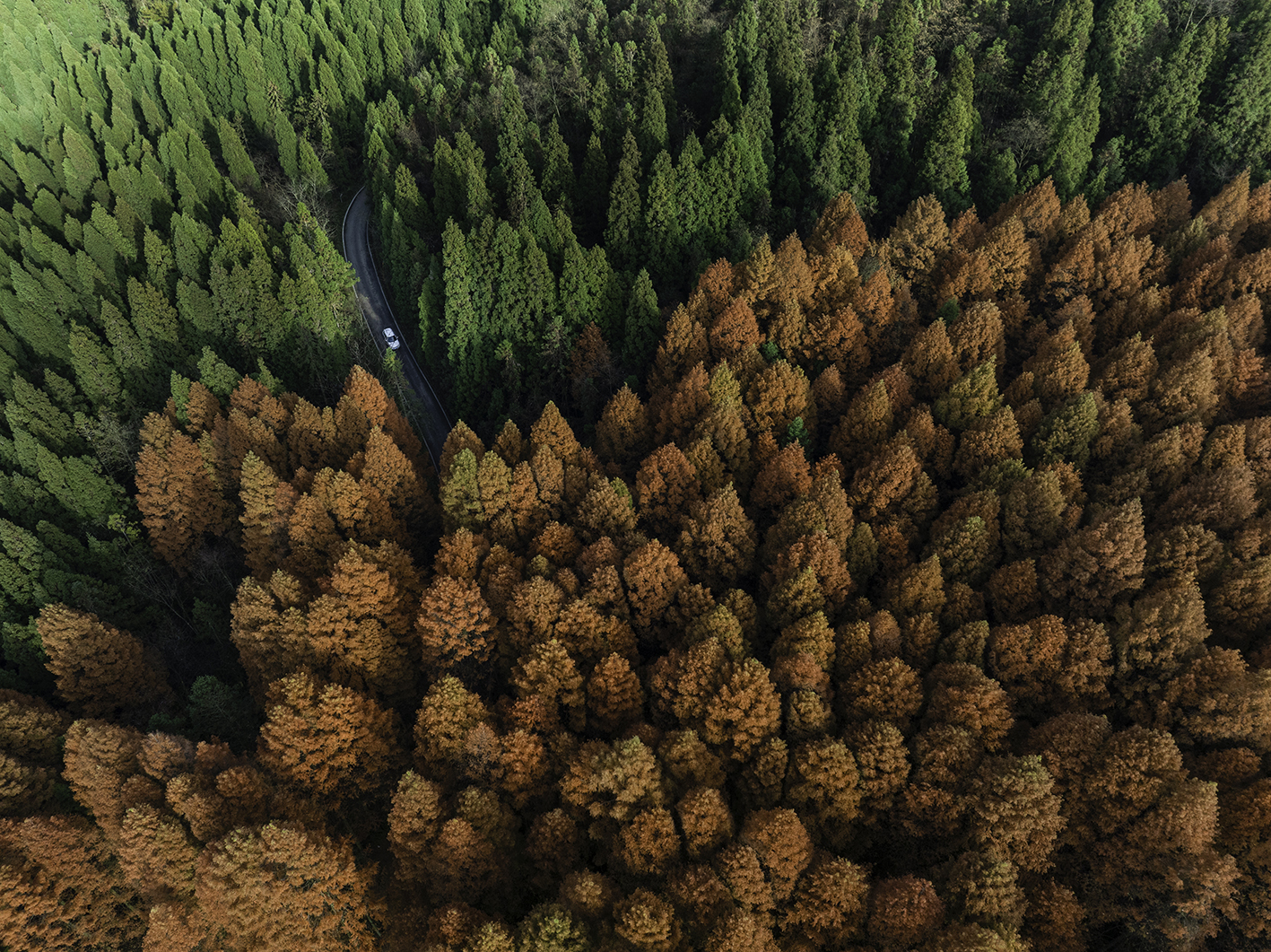 ▲2025年11月19日,涪陵区武陵山森林公园,成片红黄相间的水杉在阳光的映照下分外美丽(无人机照片)。记者 张春晓 摄
