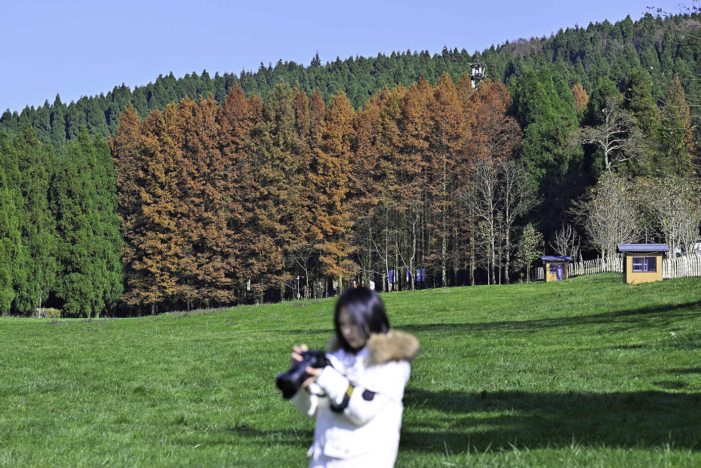 ▲11月19日,涪陵区武陵山森林公园,游人在草地与水杉林旁拍照。记者 张春晓 摄