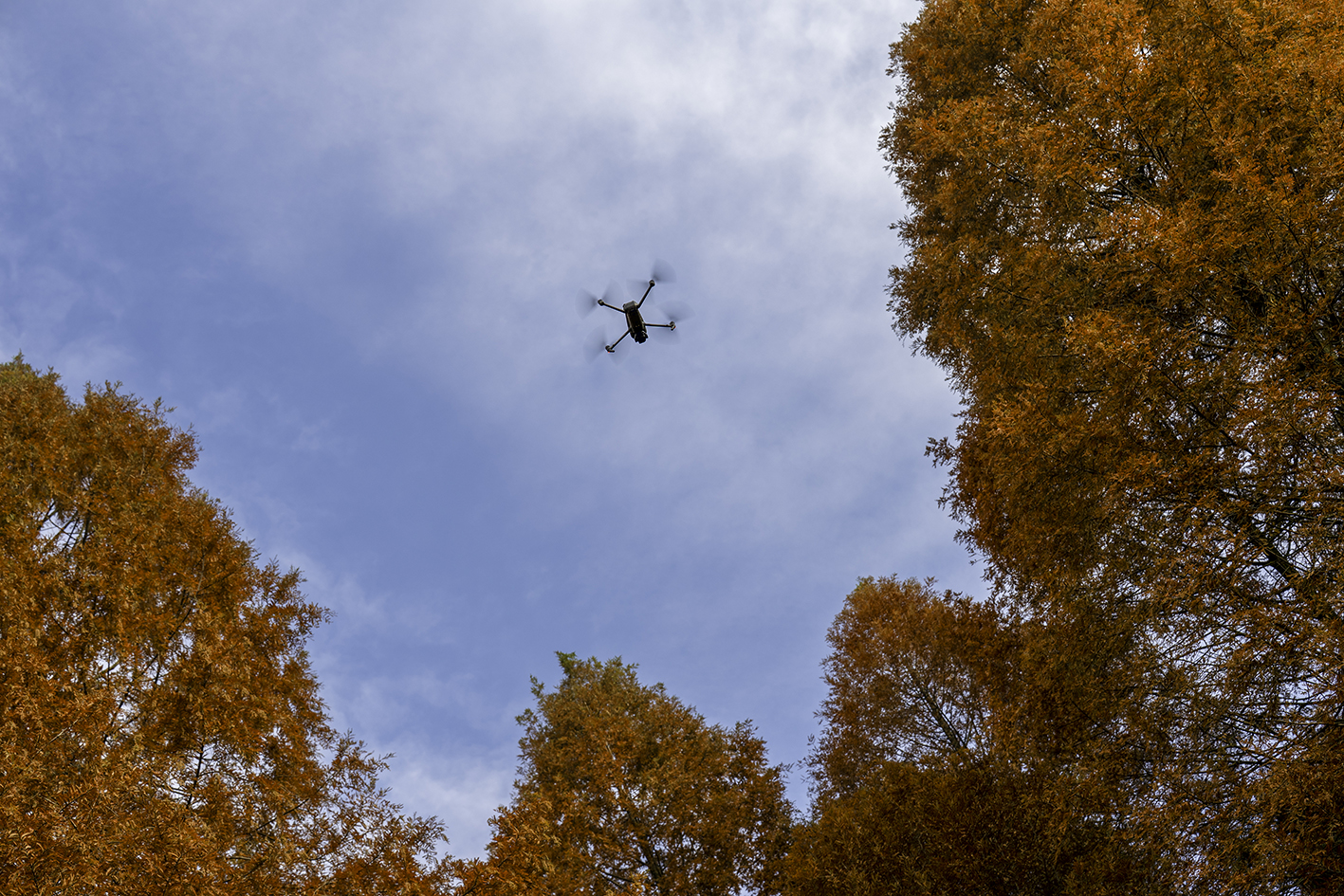 ▲11月19日,涪陵区武陵山森林公园,无人机在红黄相间的水杉林间飞行拍摄。记者 张春晓 摄