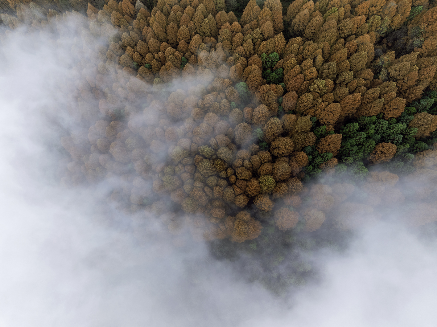▲11月19日,涪陵区武陵山森林公园,云雾中红黄相间的水杉分外美丽(无人机照片)。记者 张春晓 摄