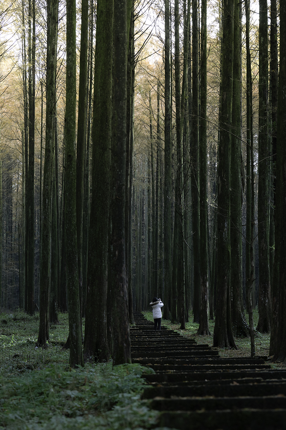 ▲11月19日,涪陵区武陵山森林公园,游人在水杉林中拍照。记者 张春晓 摄