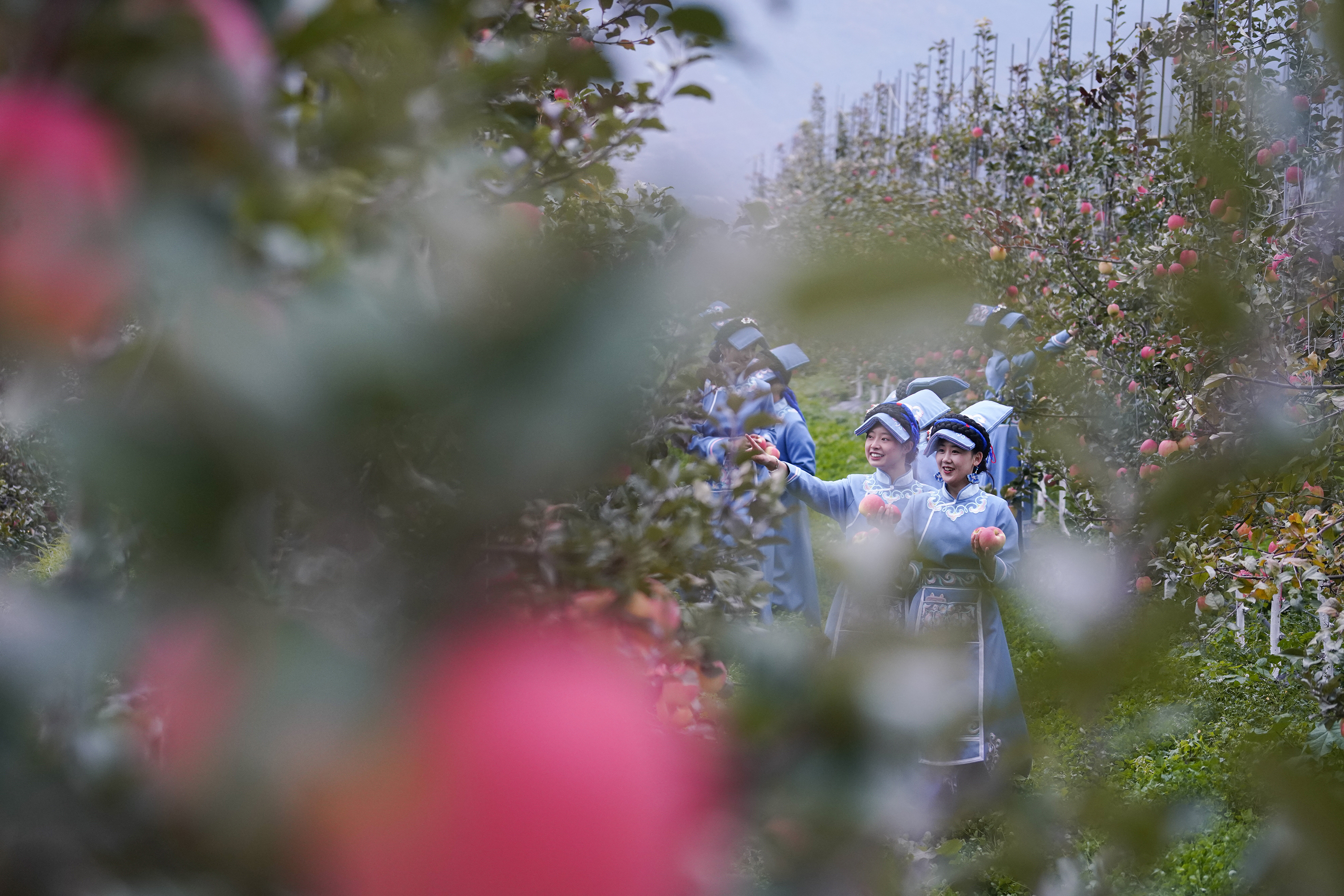 ▲11月18日,四川茂县凤仪镇坪头村苹果园,羌族女子正在采摘果实。记者 谢智强 摄