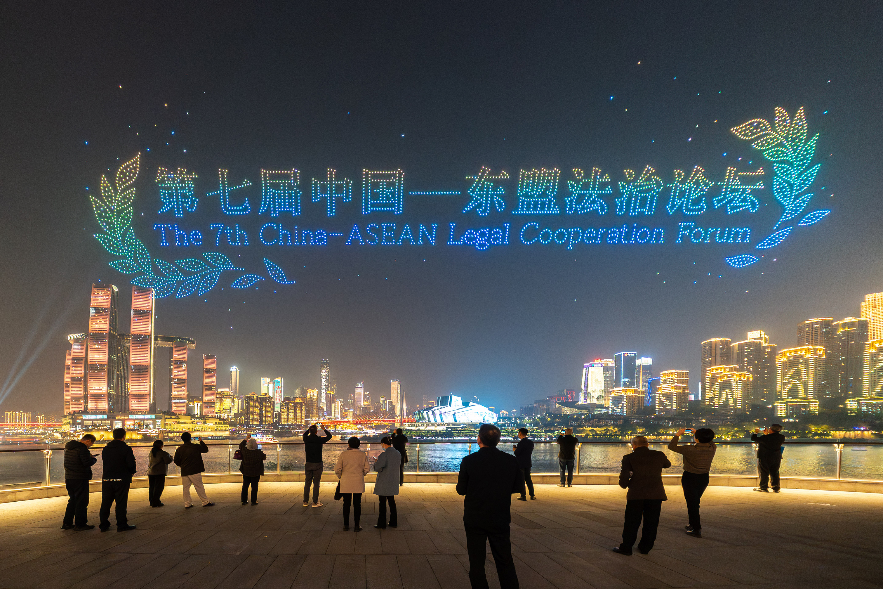 ▲11月20日,重庆市规划展览馆,第七届中国—东盟法治论坛无人机灯光秀。记者 李雨恒 摄