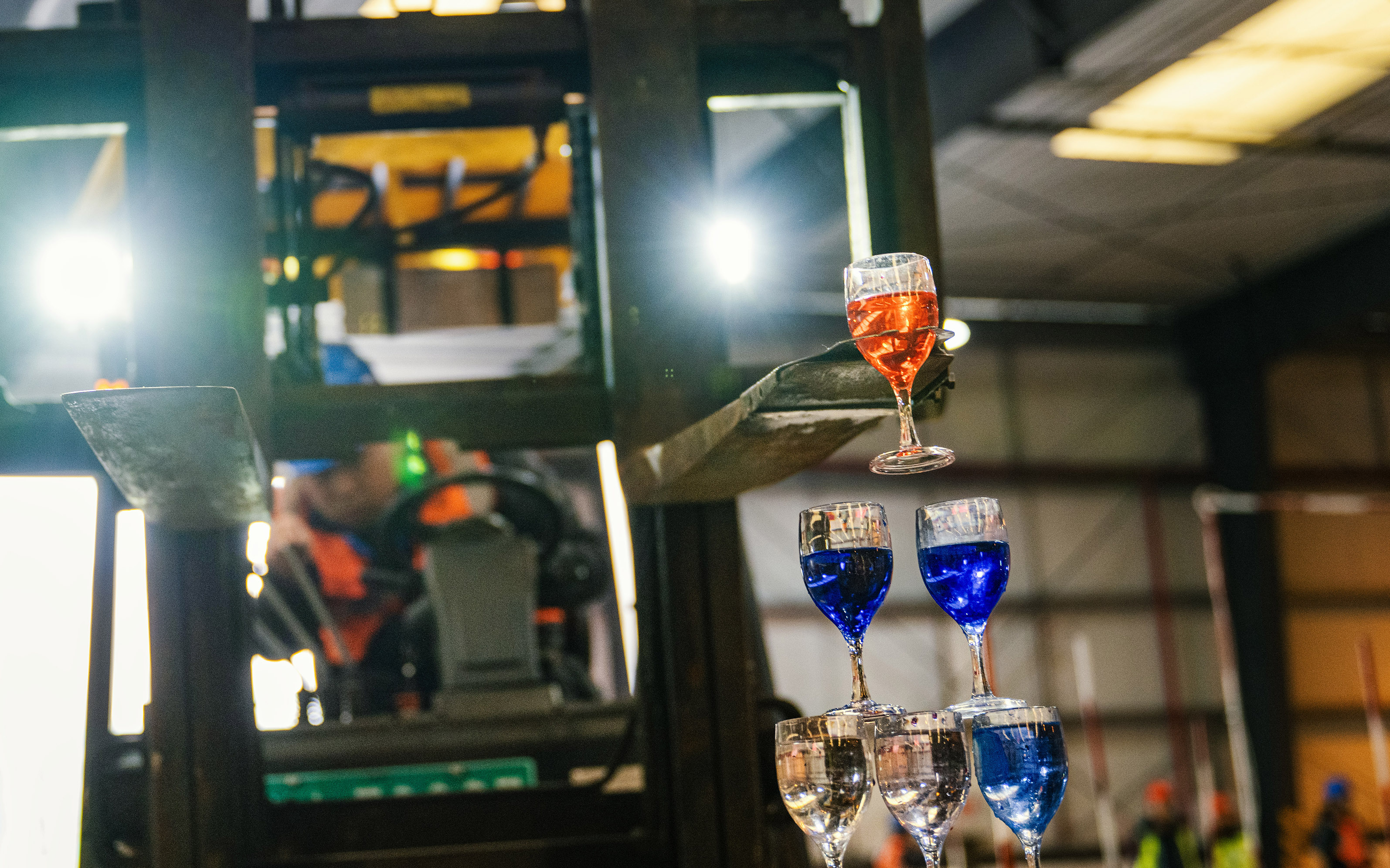 ▲11月19日,位于两江新区的重庆果园港,参赛选手操作叉车叉架上配置的专用U型工具精准“拿取”起高脚杯叠放成塔状。记者 张锦辉 摄