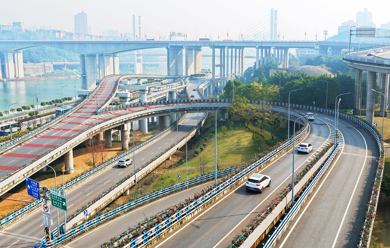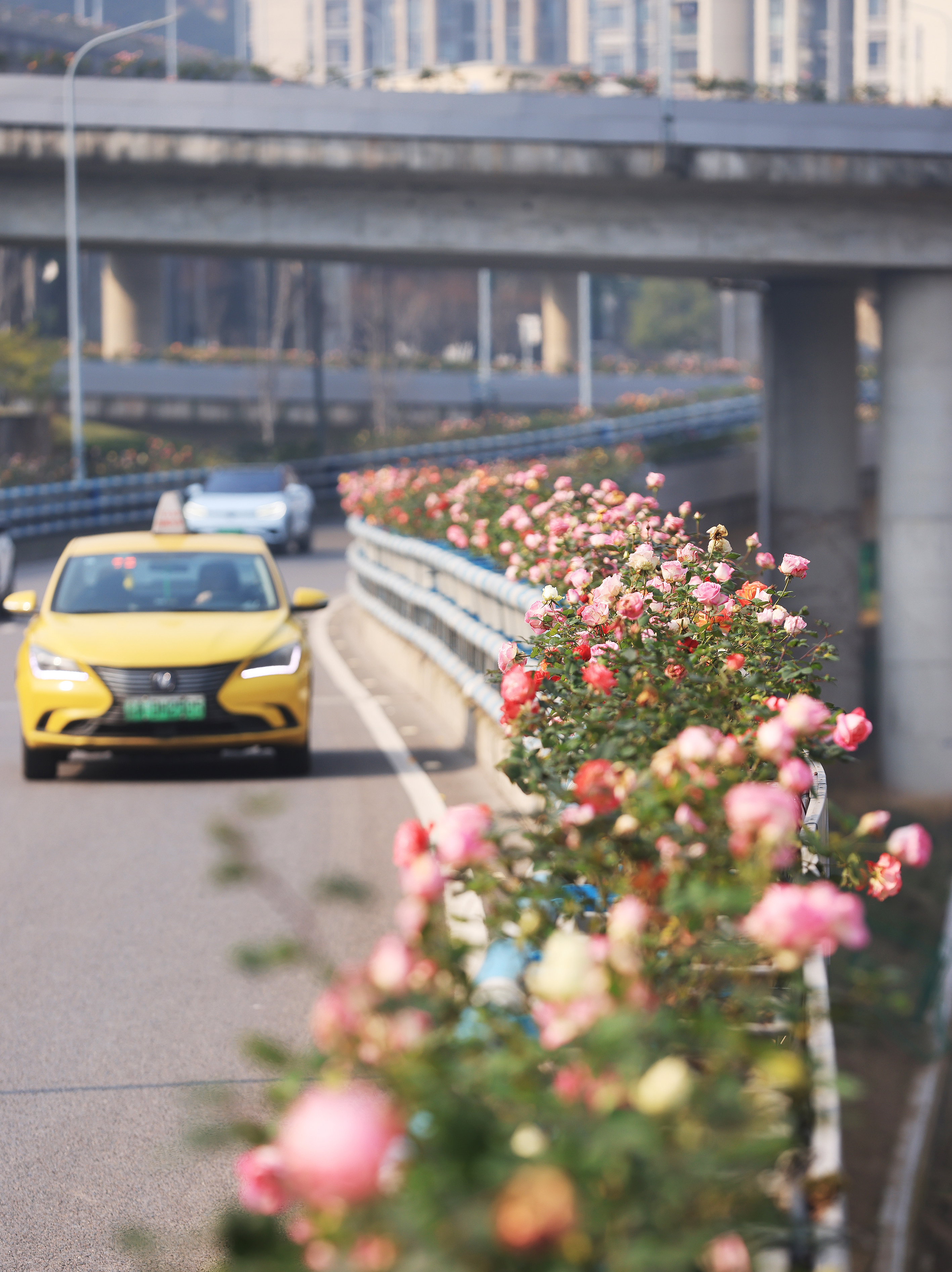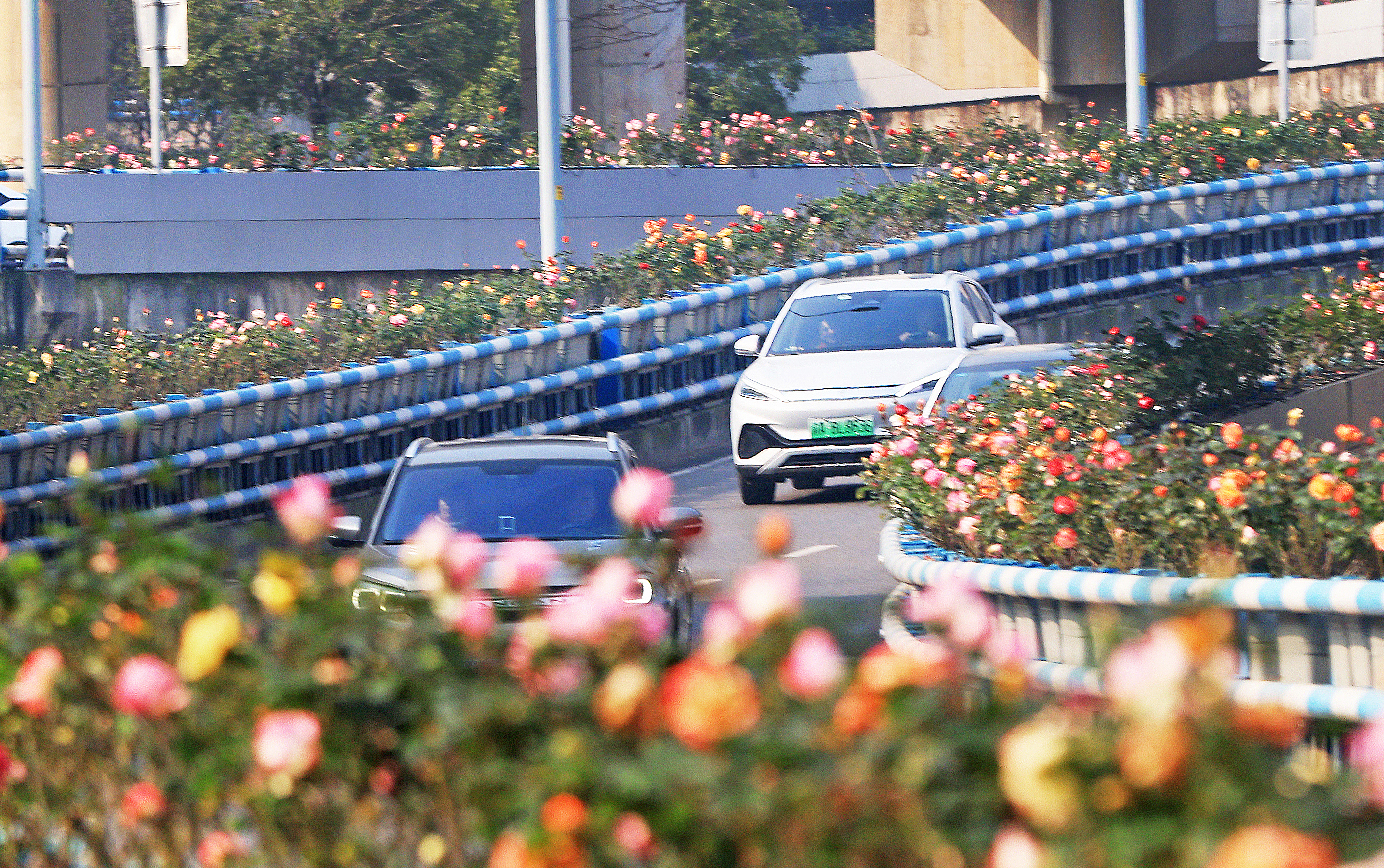 ▲2026年1月10日,沙滨路高家花园立交桥,车辆正在绽放的盆栽月季花道上行驶,亮丽的风景给人们带来好心情。特约摄影 钟志兵