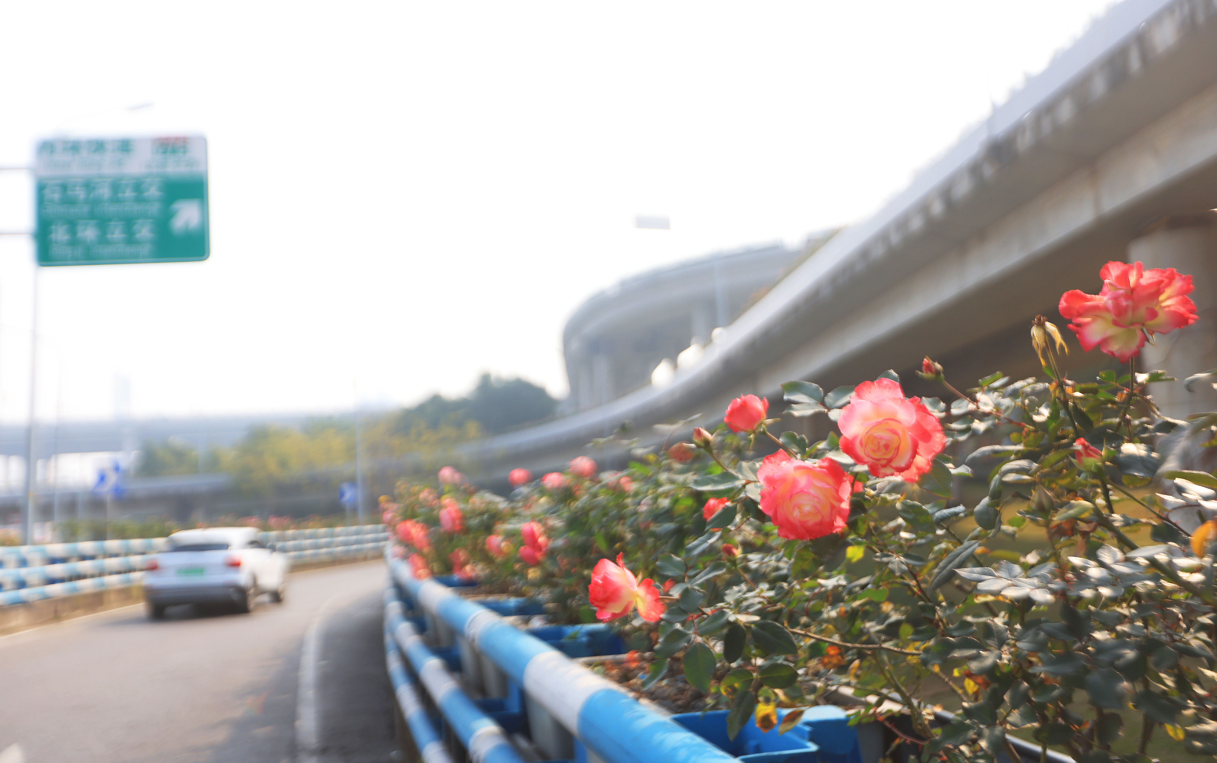 ▲1月10日,沙滨路高家花园立交桥,车辆正在绽放的盆栽月季花道上行驶,亮丽的风景给人们带来好心情。特约摄影 钟志兵