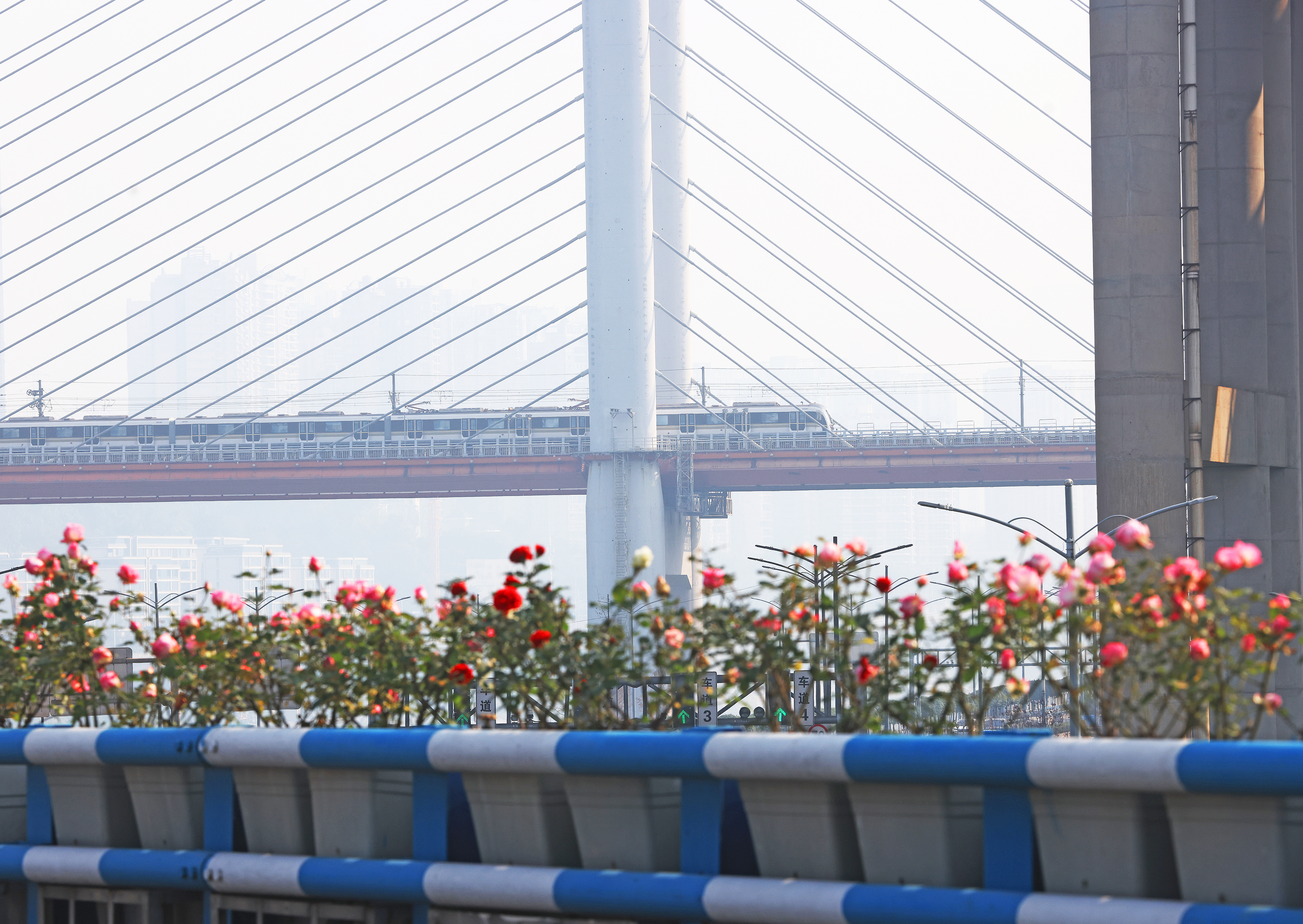 ▲1月10日,沙滨路高家花园立交桥,五彩斑斓的月季美如画。特约摄影 钟志兵