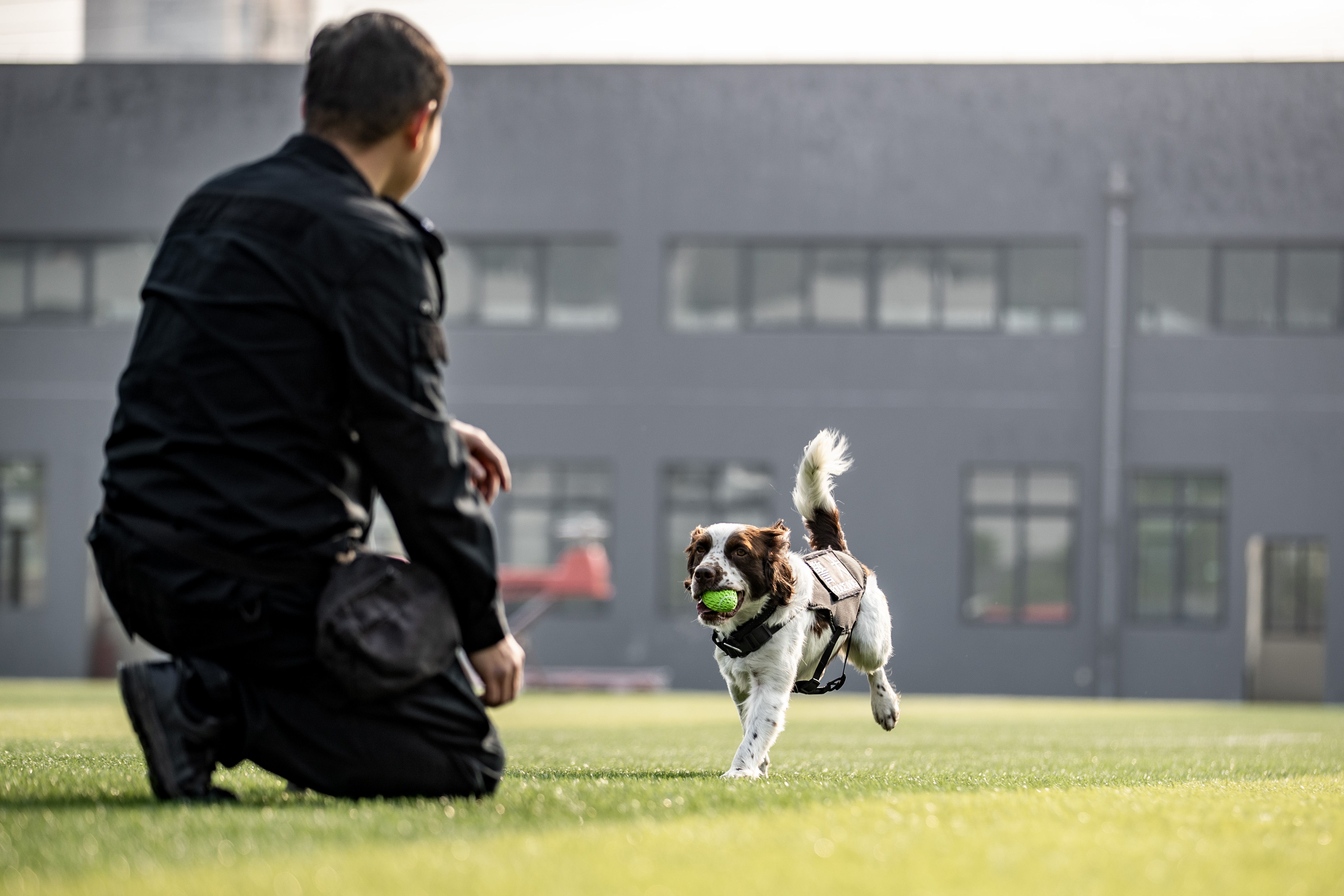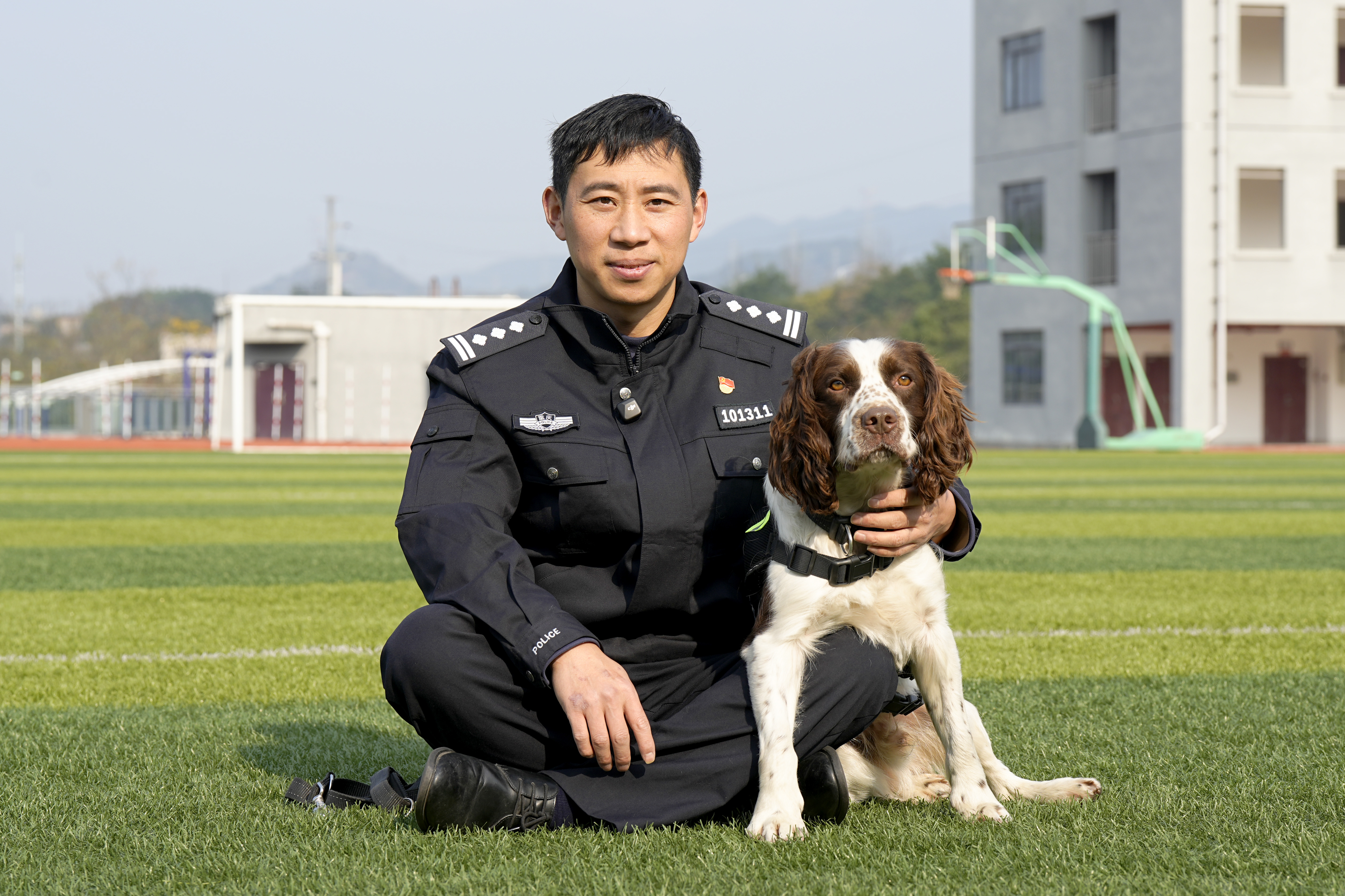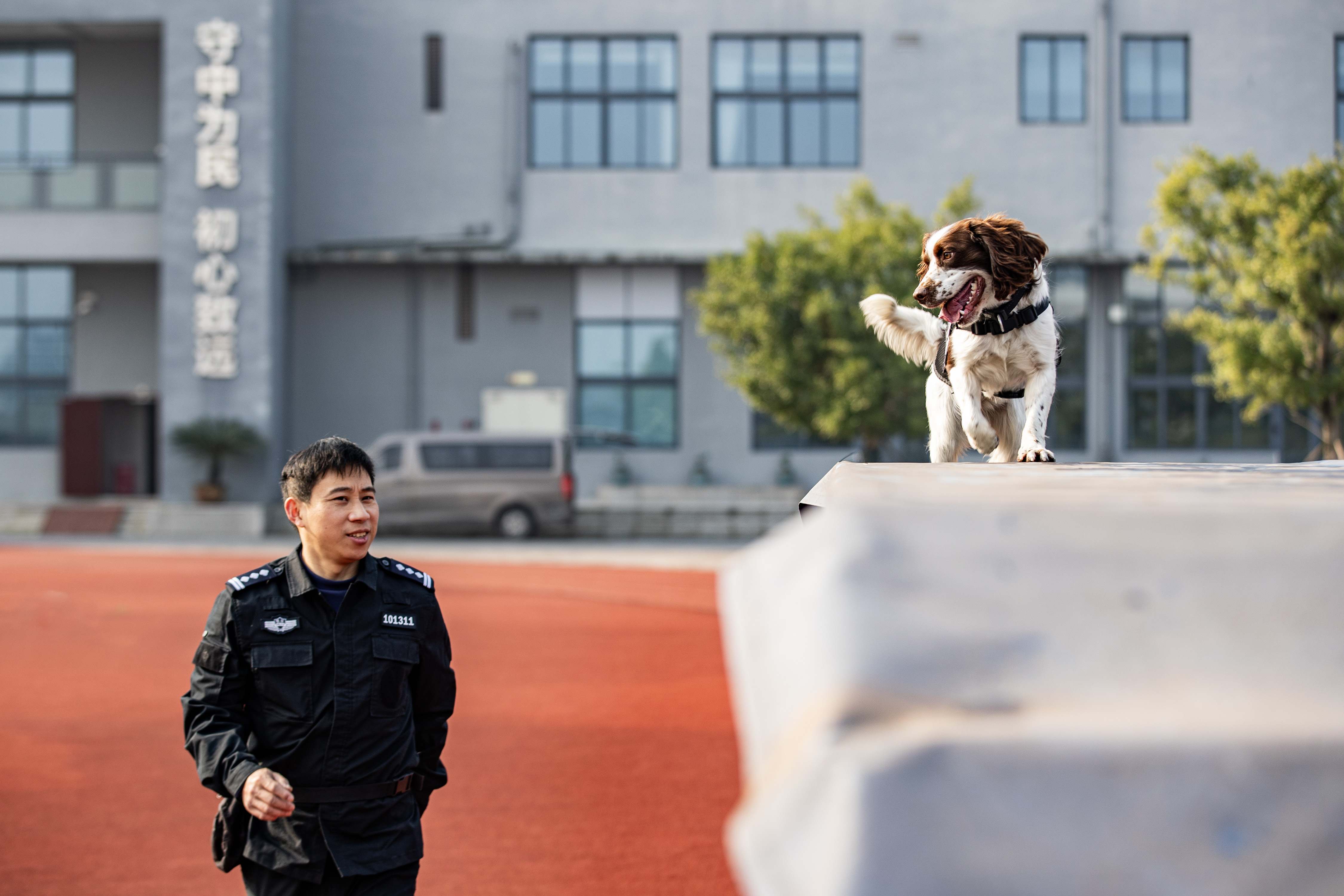 清晨,渝中区公安分局警犬训练基地还笼罩在薄雾中。一个挺拔的身影已经出现在训练场上,身边紧跟着一只步伐稳健的史宾格猎犬。