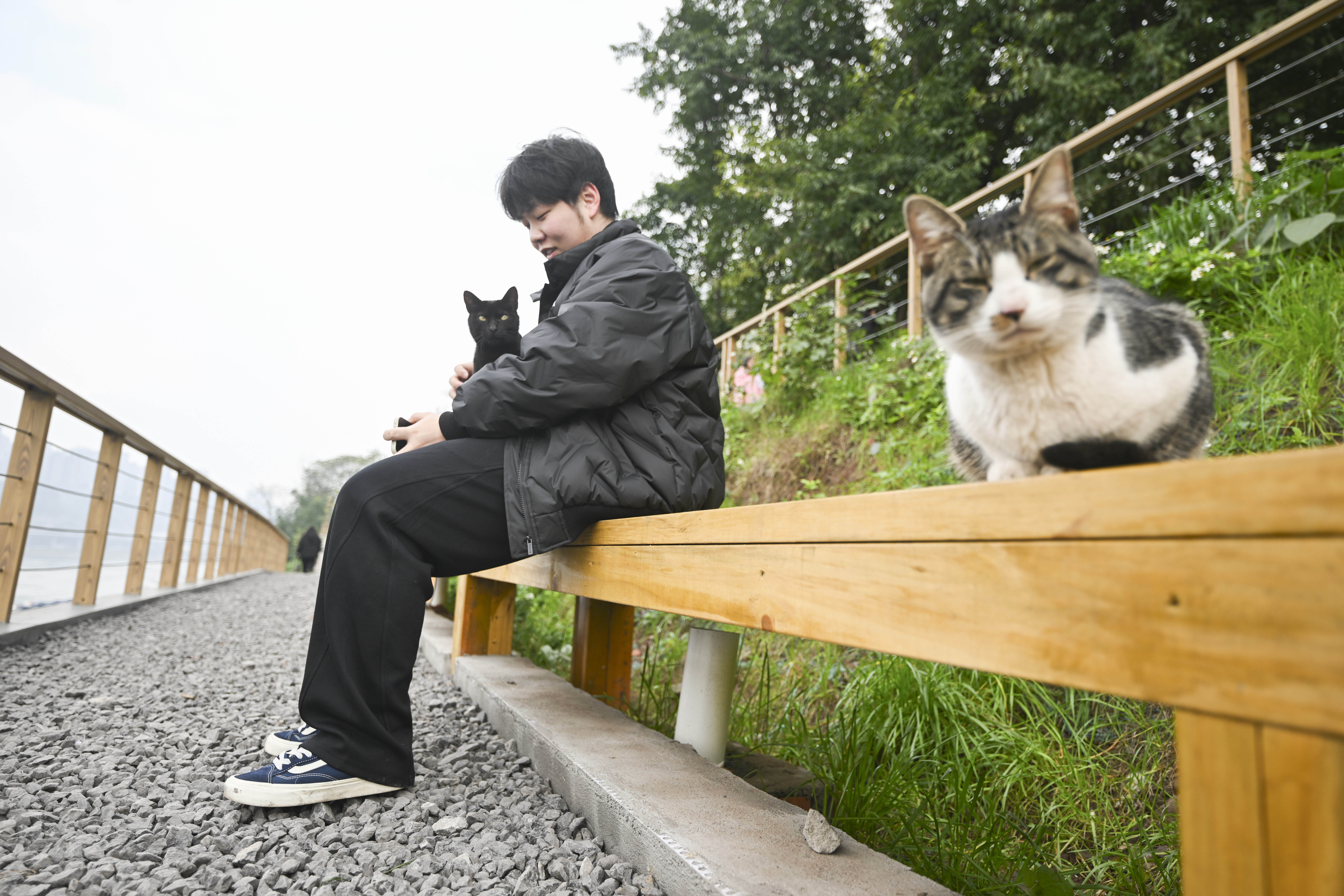 乐园中轻逗萌猫,暖意盈满眉间