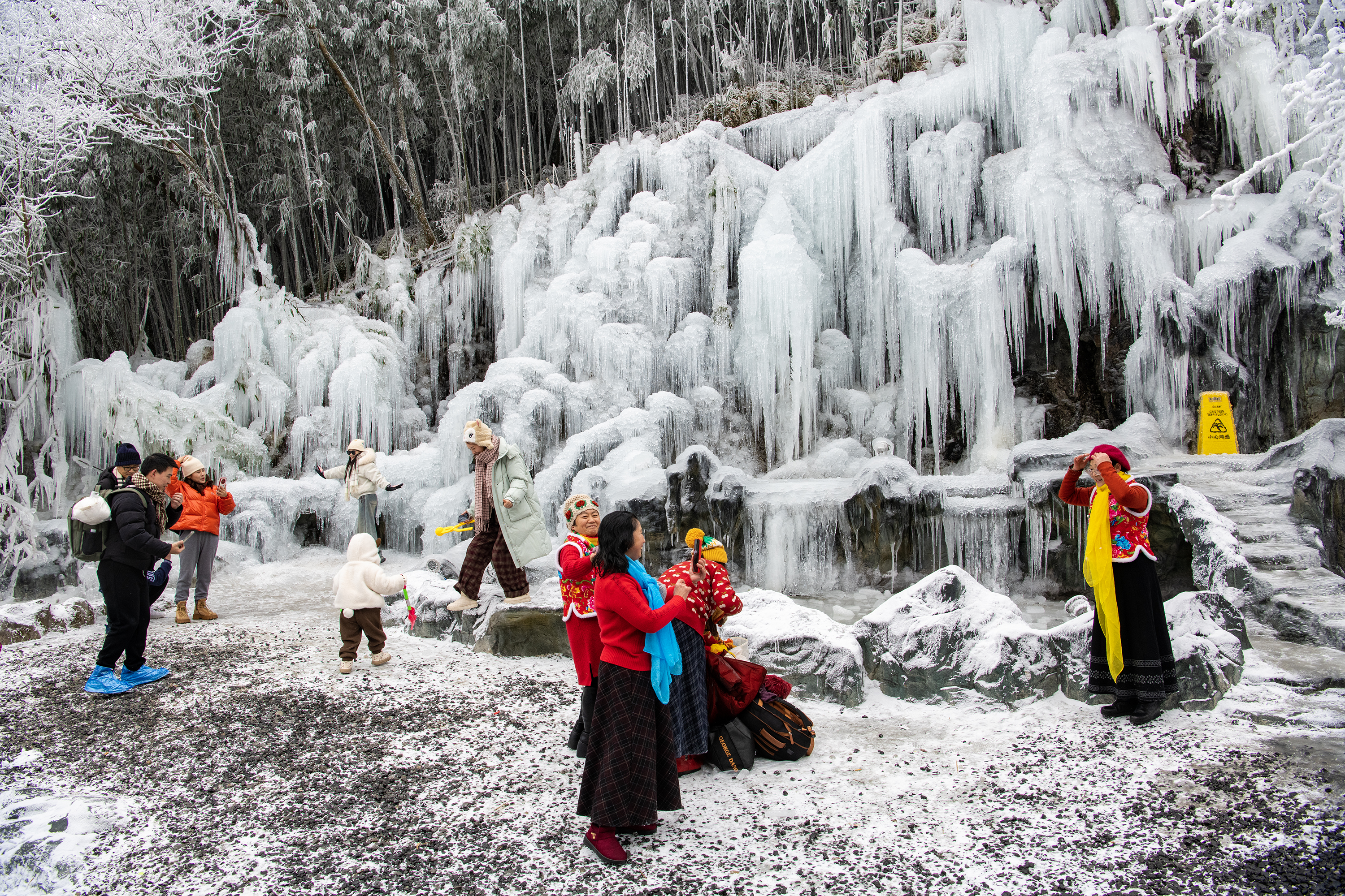 ▲1月5日,南川区金佛山景区观霞台,游客在晶莹剔透的冰瀑下拍照打卡。通讯员 胡波 摄