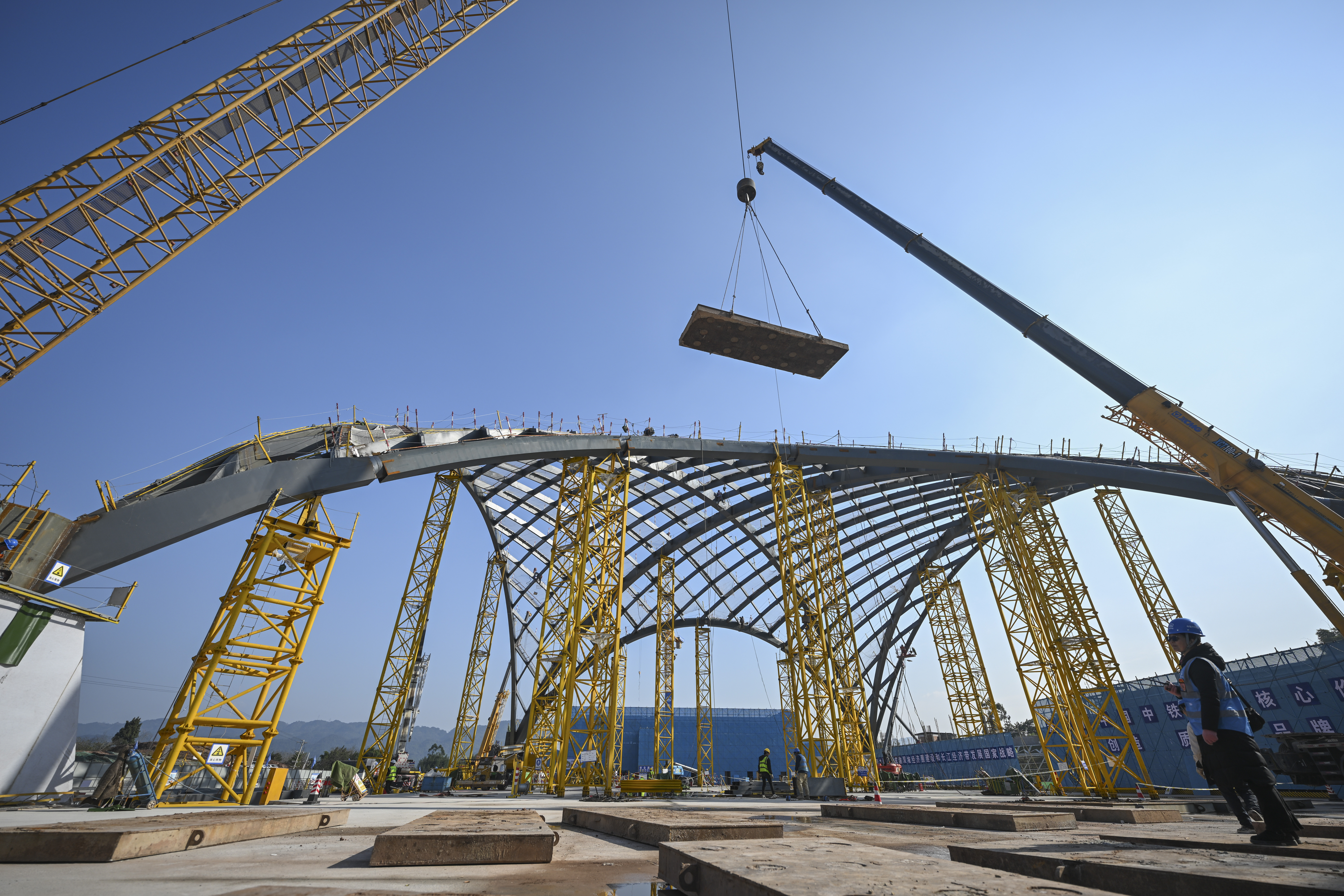 ▲1月6日,成渝中线高铁铜梁站施工现场,吊机正在运输建材。记者 谢智强 摄