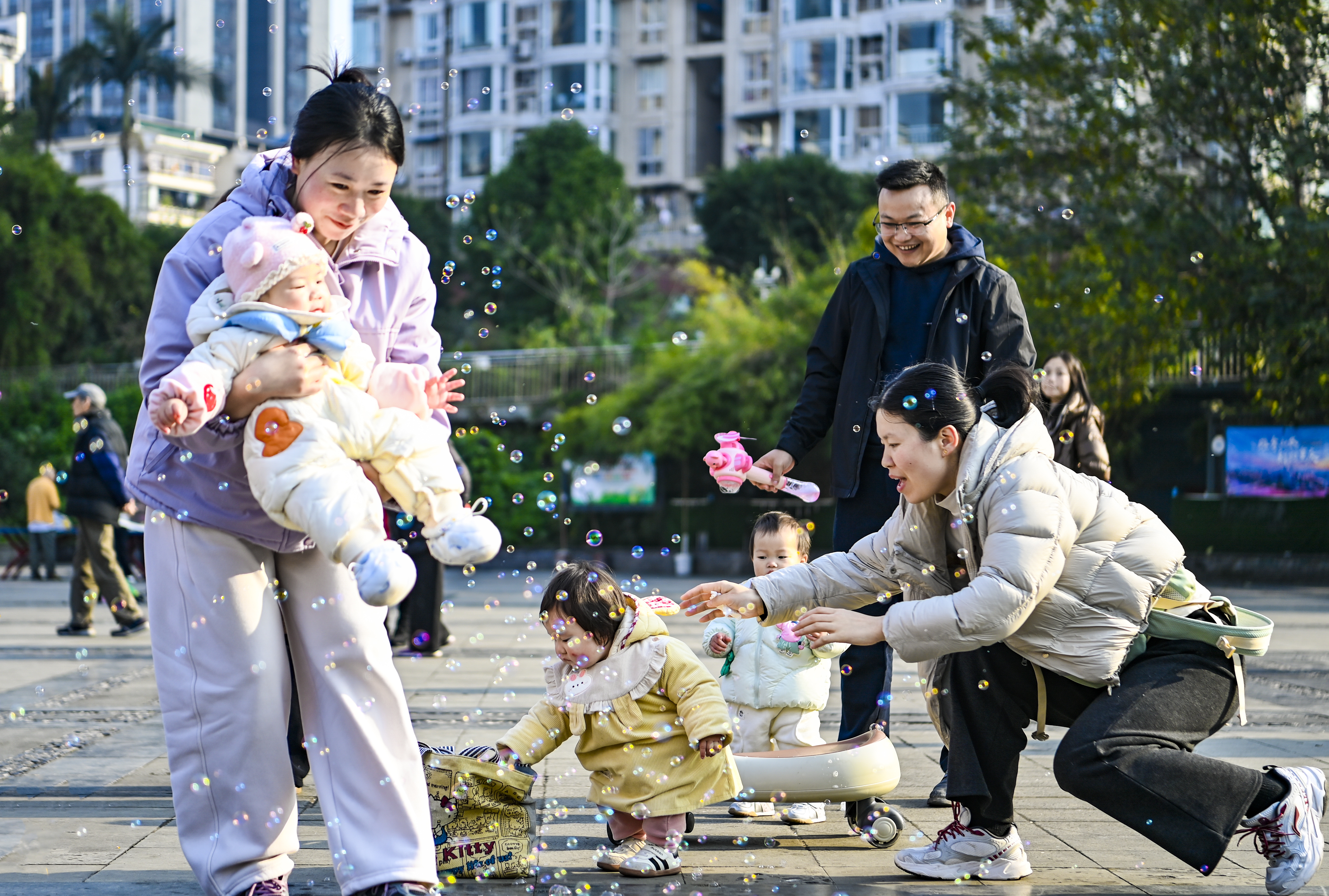 ▲1月6日,南岸区花园路街道南湖社区,家长带小朋友晒太阳。记者 齐岚森 摄