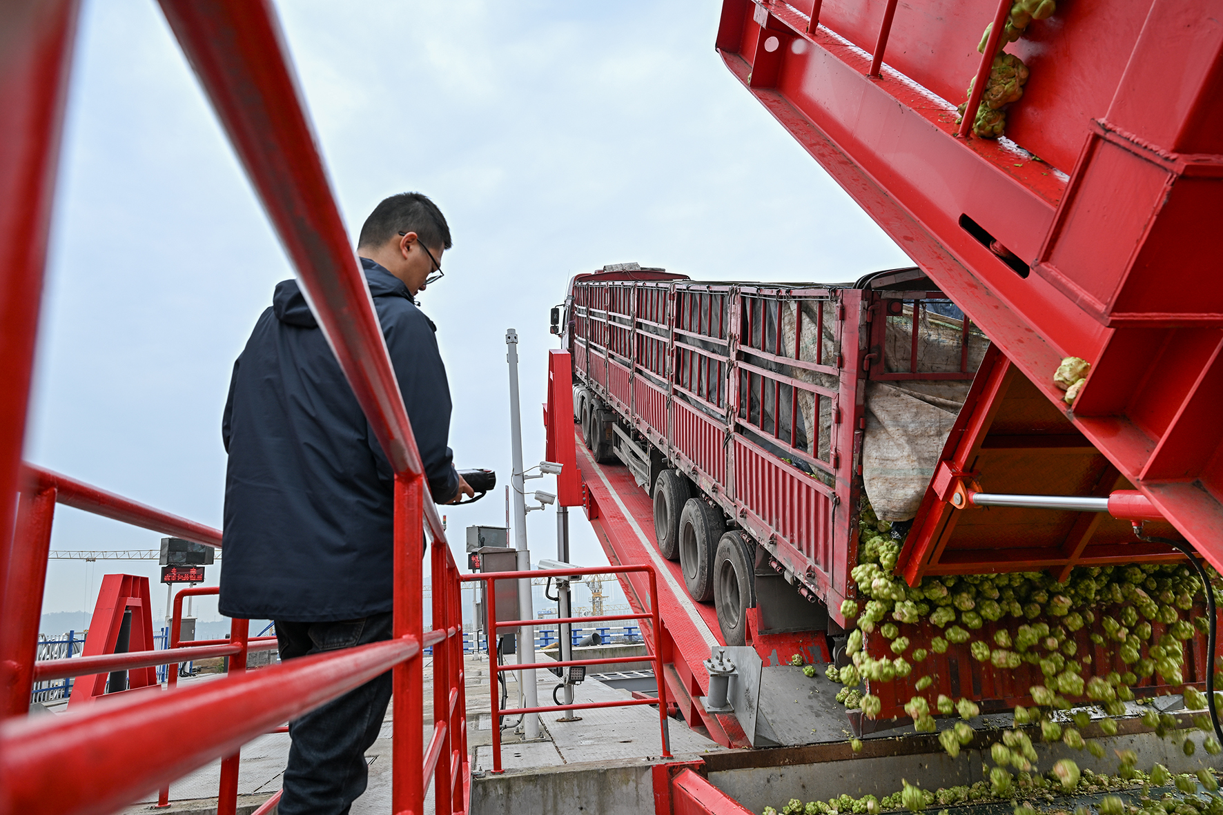 ▲1月7日,乌江涪陵榨菜绿色智能化基地,工人操纵自动卸车平台卸载青菜头。记者 张春晓 摄