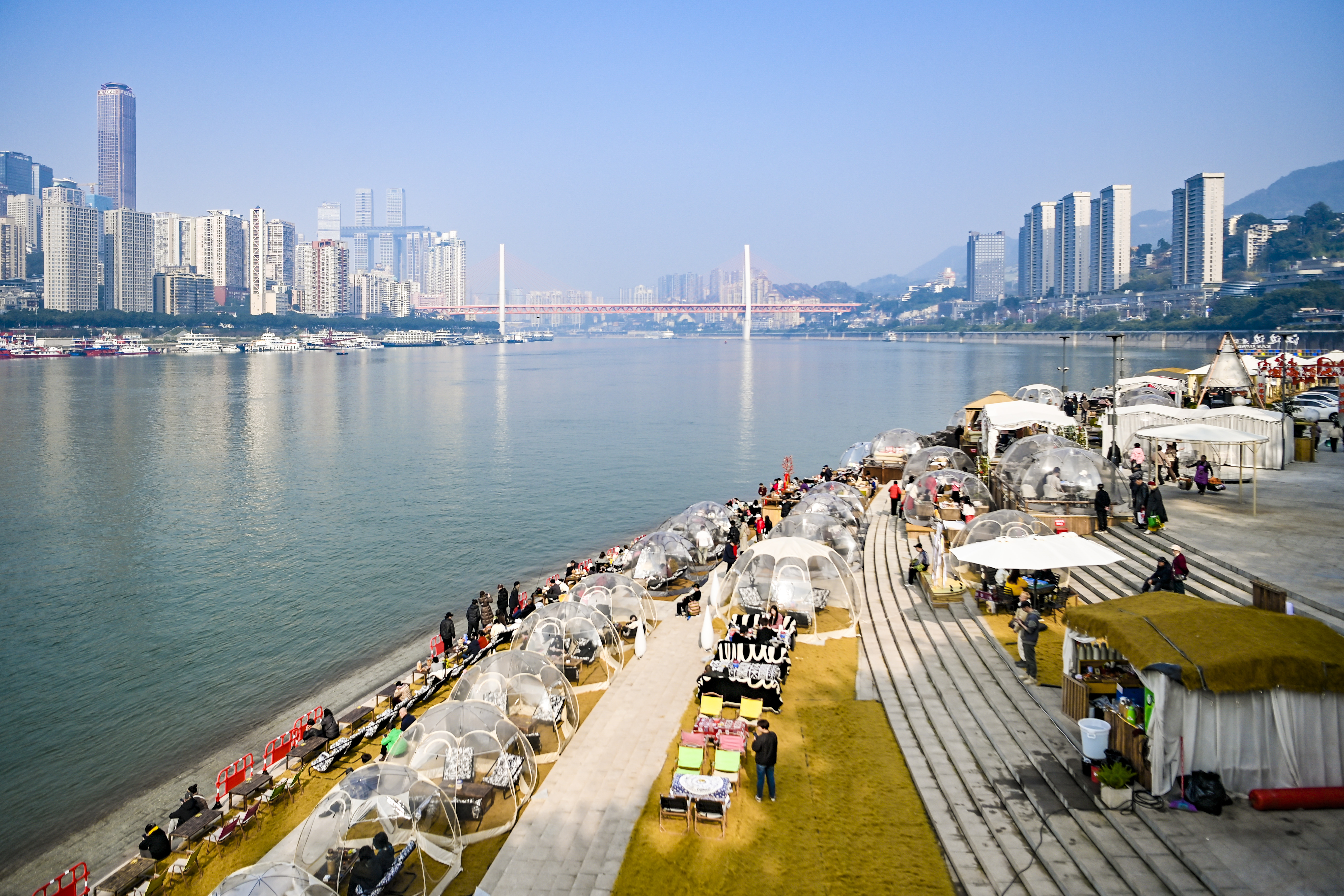 ▲1月9日,南岸区南滨路,市民到江边赏江景、晒太阳。记者 齐岚森 摄