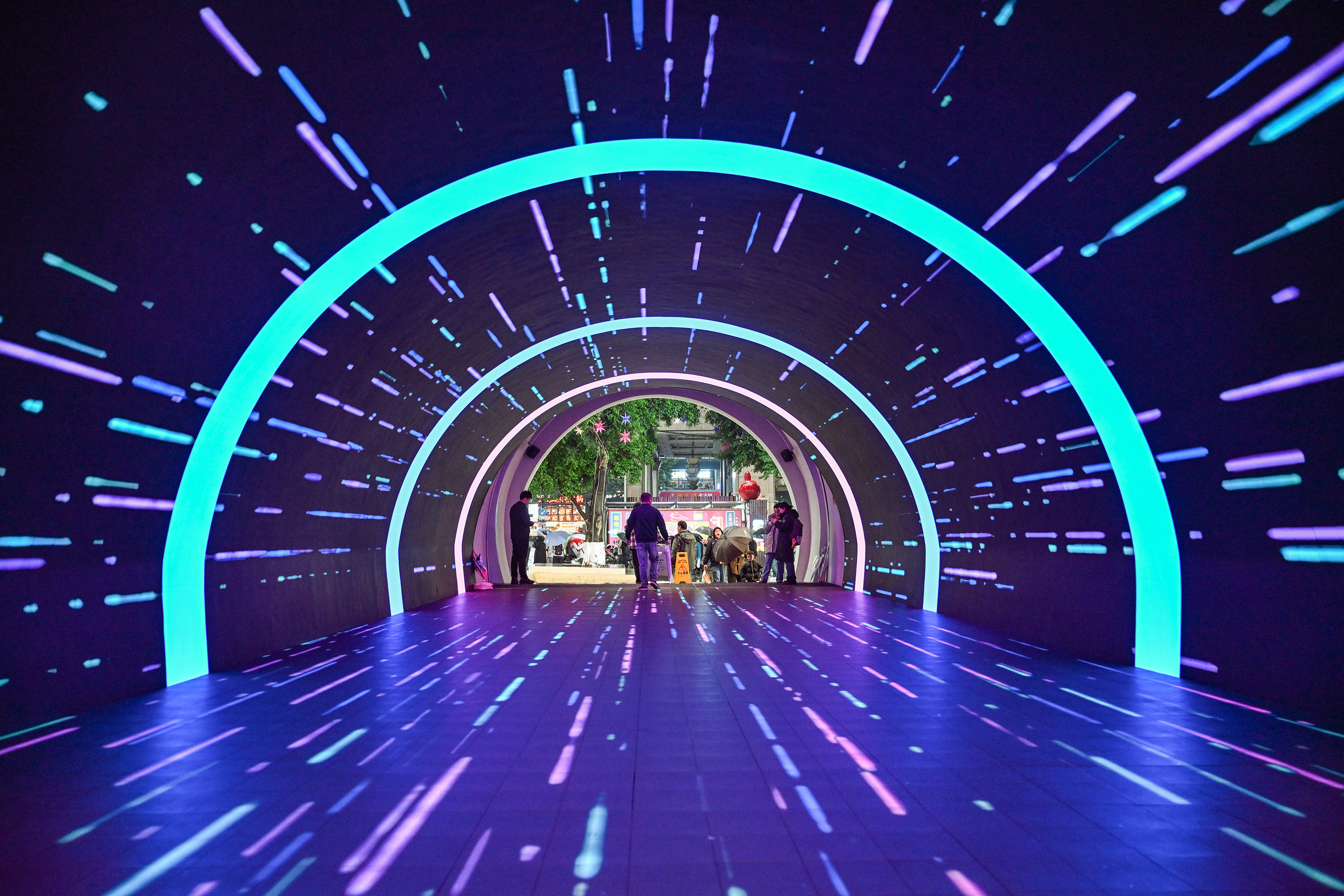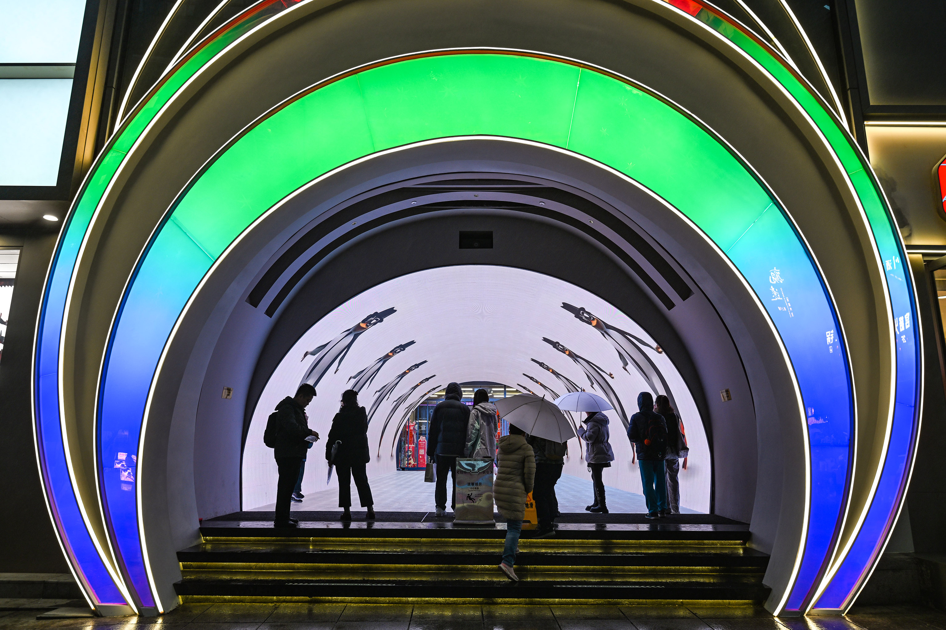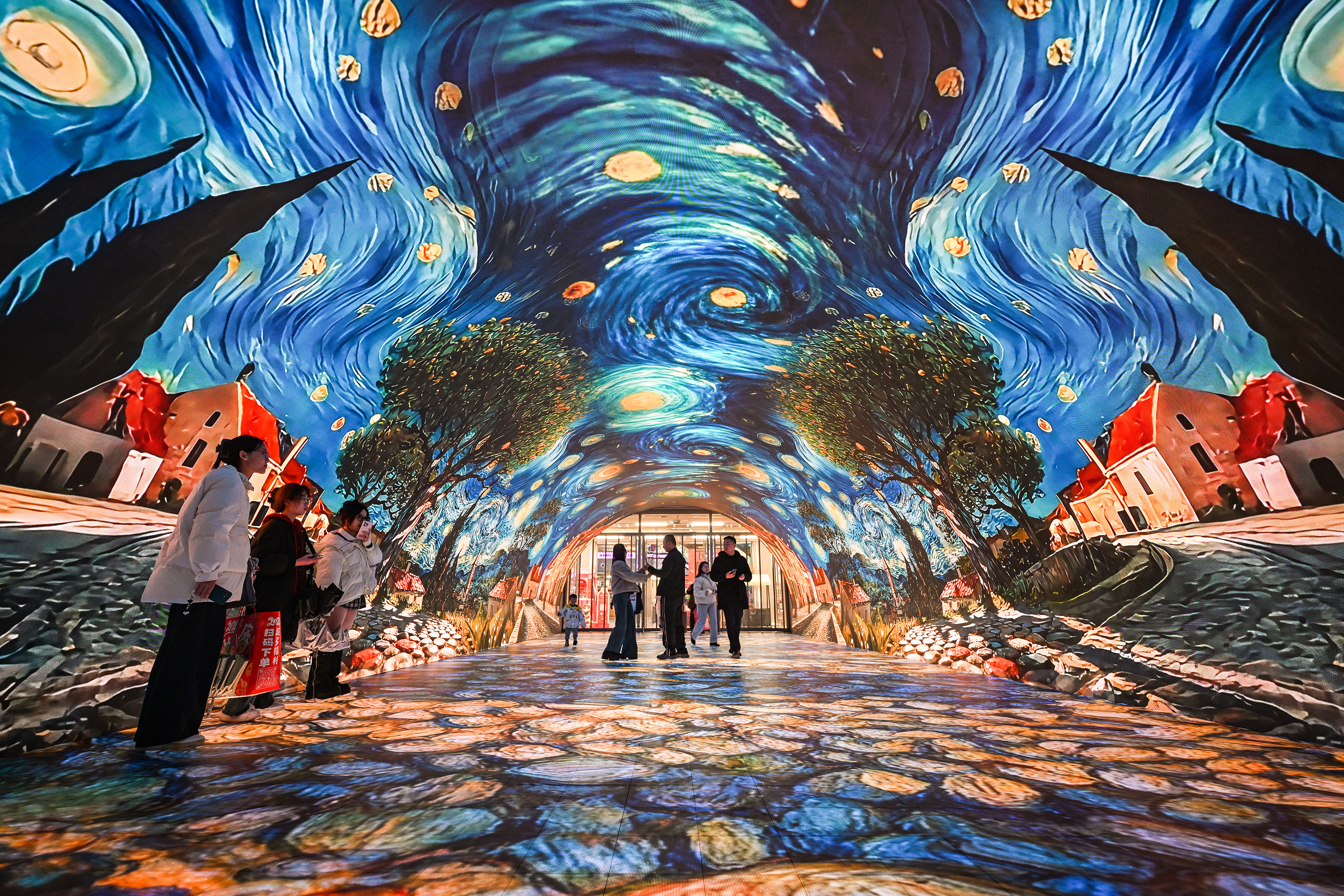 位于渝中区解放碑的一商场人行通道成为来往市民、游客的热门打卡点。该通道全覆盖LED屏,图案循环变换,时而映出《星月夜》旋涡光影,时而铺就流动银河,墙地光影交相呼应,动态企鹅画面还引得游客合拍共舞。沉浸式场景持续聚人气,为商场高效引流,激活商圈消费活力。