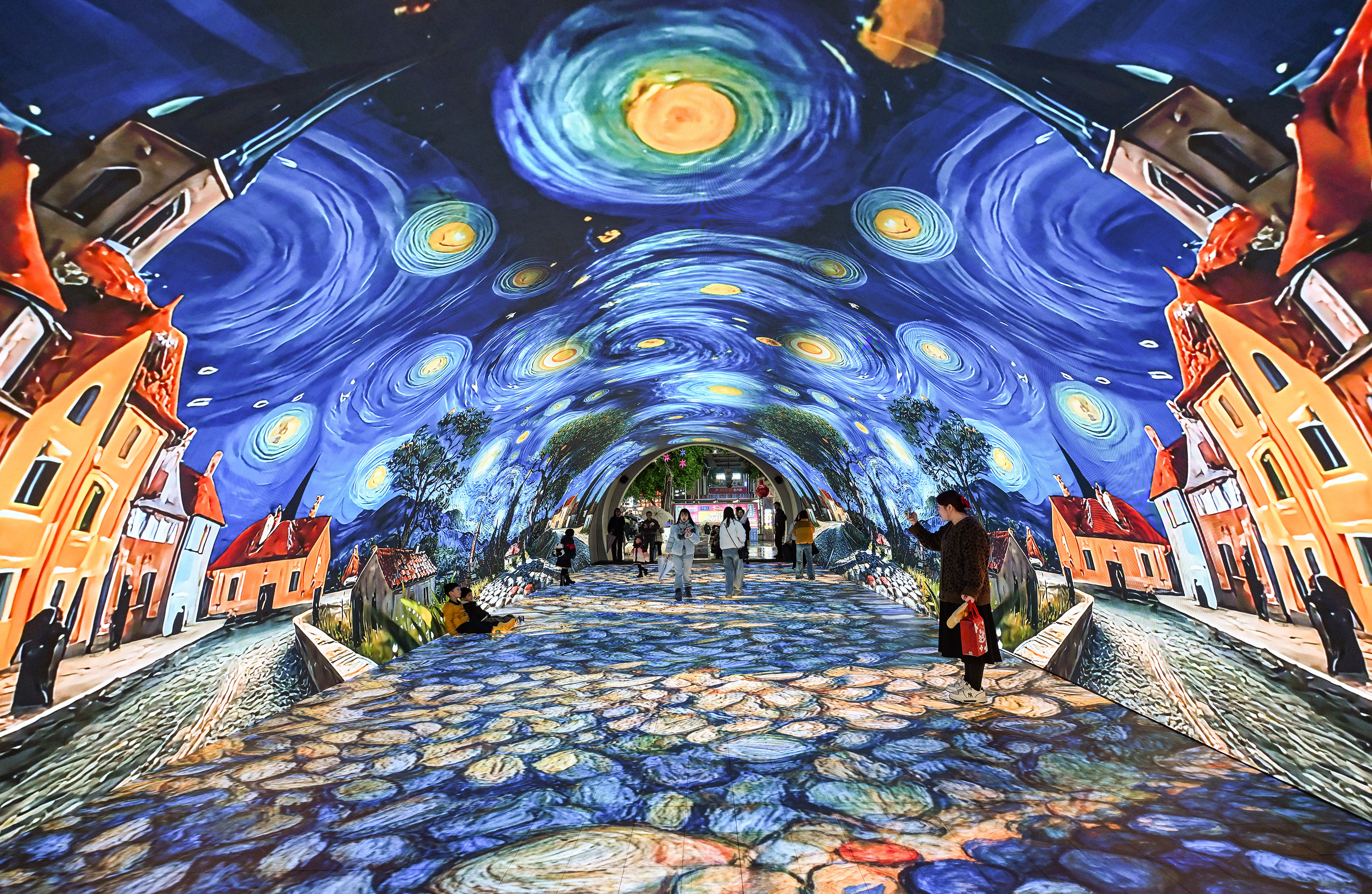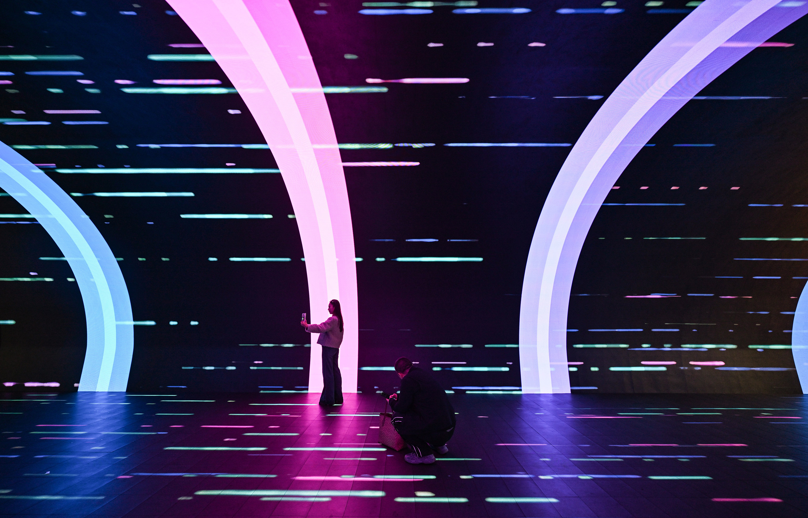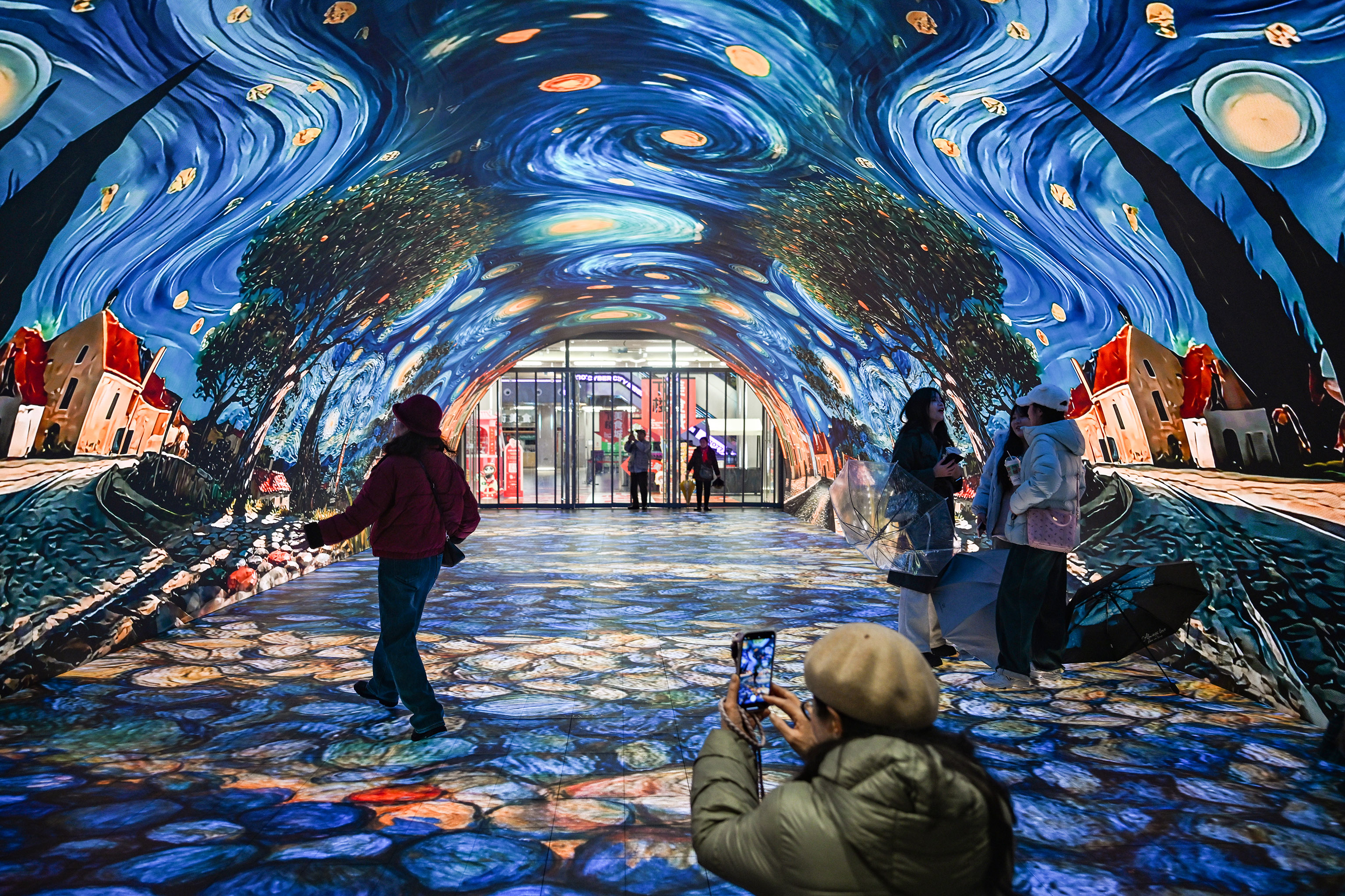 位于渝中区解放碑的一商场人行通道成为来往市民、游客的热门打卡点。该通道全覆盖LED屏,图案循环变换,时而映出《星月夜》旋涡光影,时而铺就流动银河,墙地光影交相呼应,动态企鹅画面还引得游客合拍共舞。沉浸式场景持续聚人气,为商场高效引流,激活商圈消费活力。
