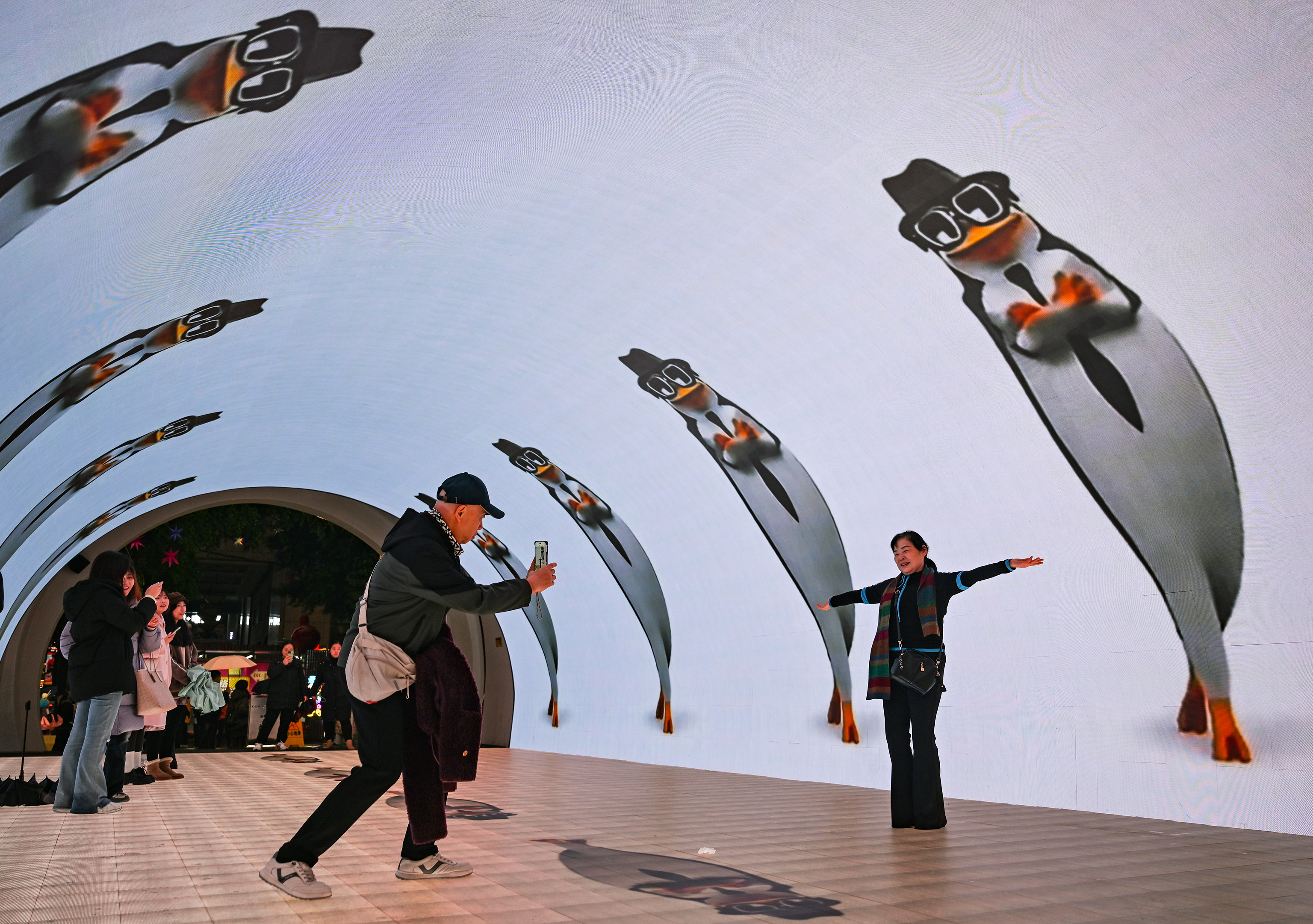 ▲1月19日,渝中区解放碑一商场通道,动态企鹅画面吸引游客合拍共舞。首席记者 龙帆 摄