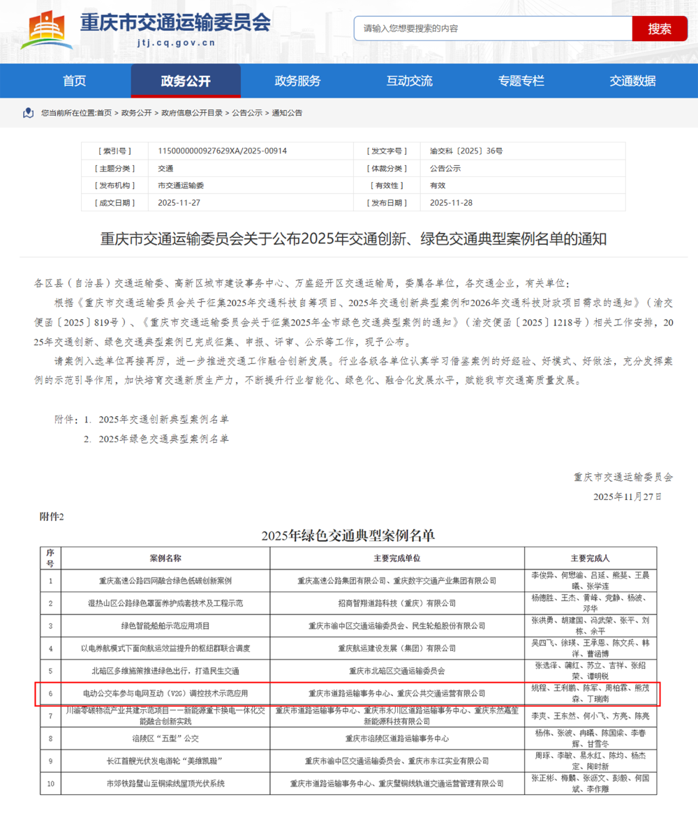 近日,重庆交通开投集团公交运营公司驿满新能源公司(以下简称“驿满新能源公司”)实施的重庆公交光储充一体化项目,凭借其创新性的节能实践与显著成效,从众多申报项目中脱颖而出,成功入选交通运输部“讲好交通节能故事”第一批典型案例,成为全国12个典型案例之一;其电动公交车参与电网互动(V2G)调控技术示范应用更成为重庆市2025年绿色交通典型案例,实现了荣誉双收,成为全国交通运输绿色低碳发展的实践范本。